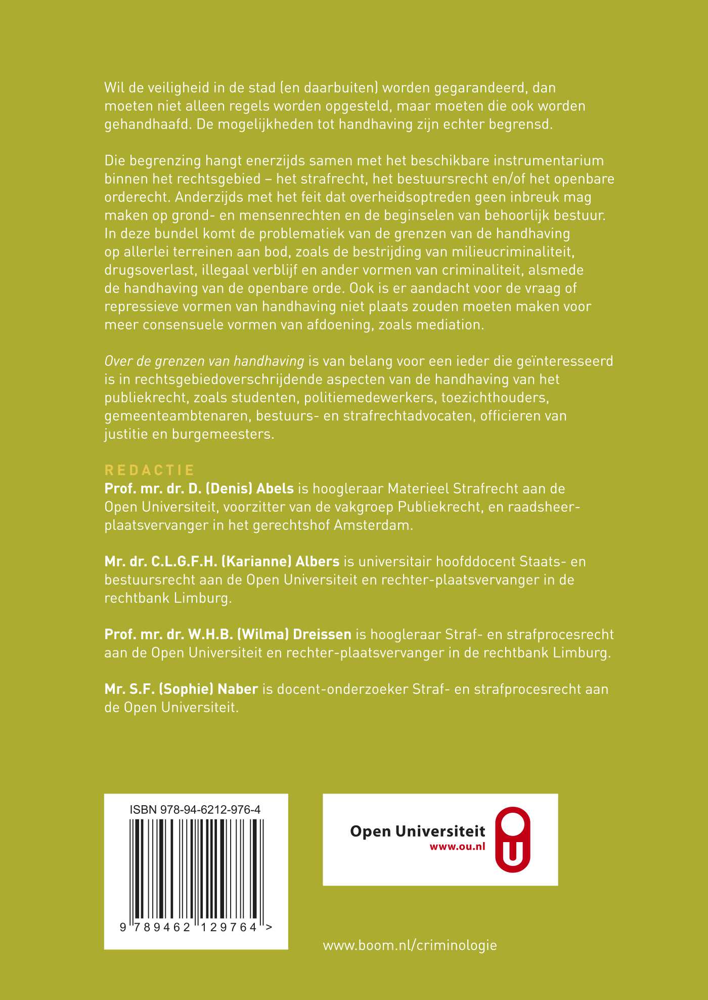 Die begrenzing hangt enerzijds samen met het beschikbare instrumentarium binnen het rechtsgebied - het strafrecht, het bestuursrecht en/of het openbare orderecht. Anderzijds met het feit dat overheidsoptreden geen inbreuk mag maken op grond- en mensenrechten en de beginselen van behoorlijk bestuur. In deze bundel komt de problematiek van de grenzen van de handhaving op allerlei terreinen aan bod, zoals de bestrijding van milieucriminaliteit, drugsoverlast, illegaal verblijf en ander vormen van criminaliteit, alsmede de handhaving van de openbare orde. Ook is er aandacht voor de vraag of repressieve vormen van handhaving niet plaats zouden moeten maken voor meer consensuele vormen van afdoening, zoals mediation.
