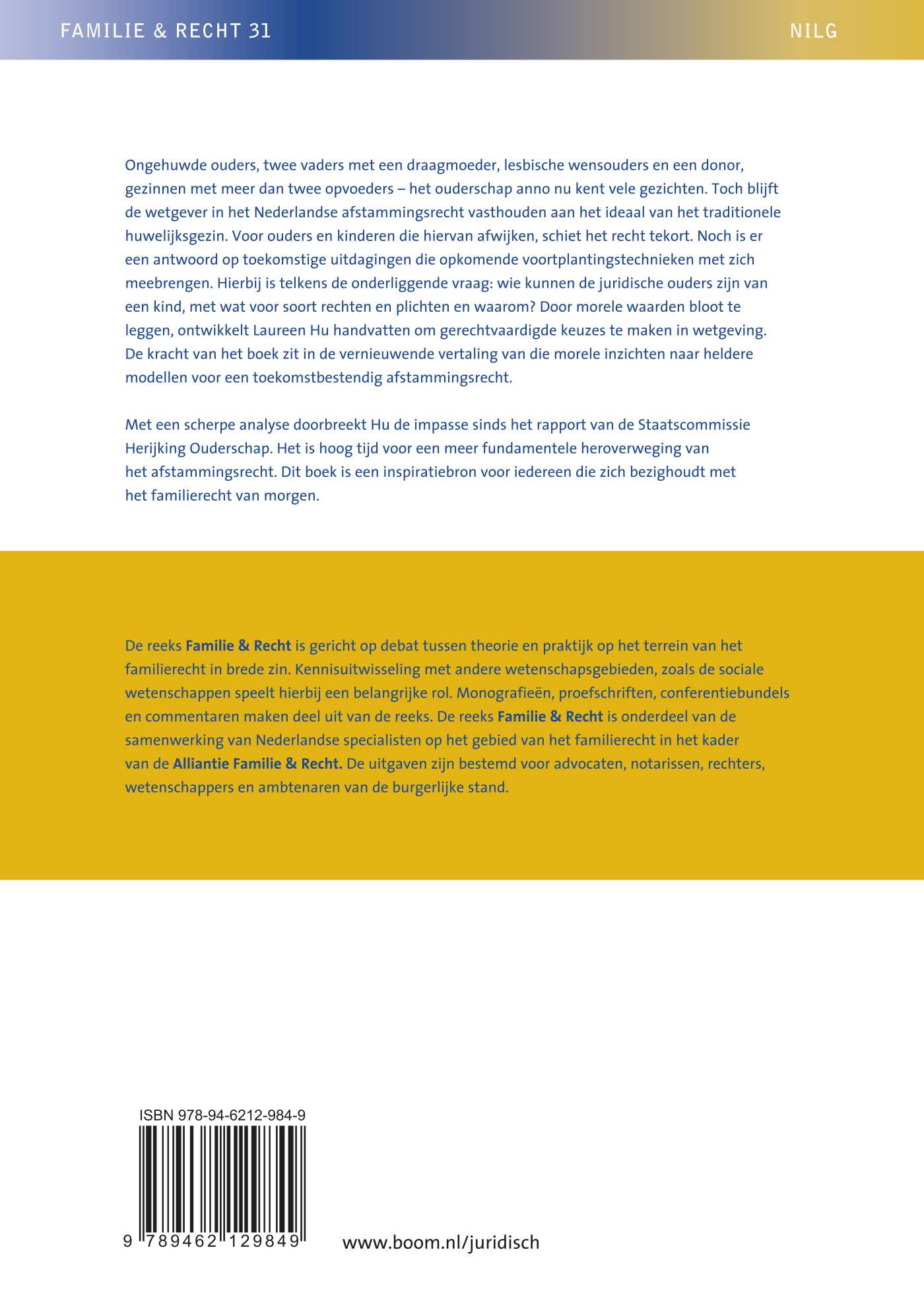 Met een scherpe analyse doorbreekt Hu de impasse sinds het rapport van de Staatscommissie Herijking Ouderschap. Het is hoog tijd voor een meer fundamentele heroverweging van het afstammingsrecht. Dit boek is een inspiratiebron voor iedereen die zich bezighoudt met het familierecht van morgen.