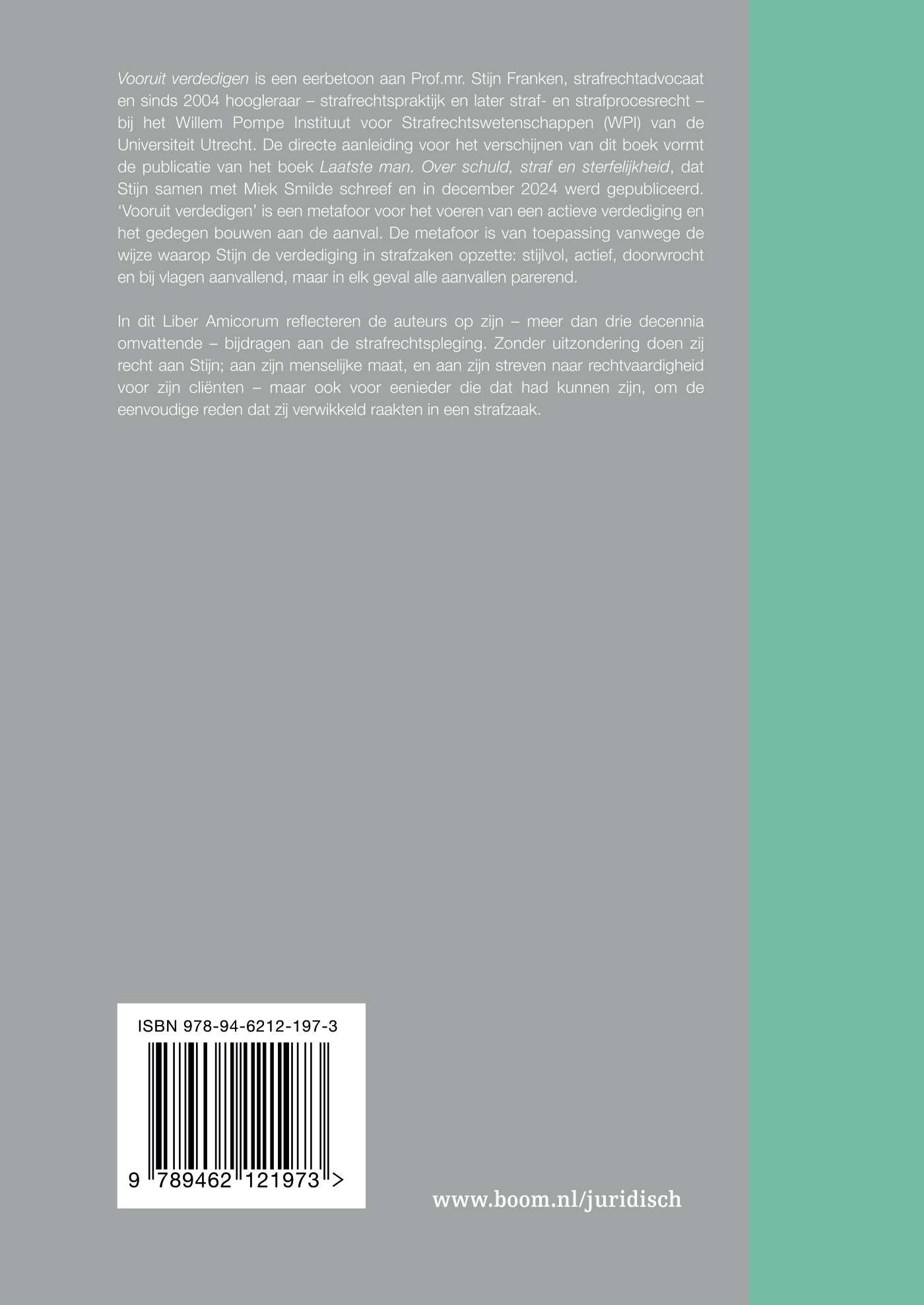Vooruit verdedigen is een eerbetoon aan Prof.mr. Stijn Franken, strafrechtadvocaat en sinds 2004 hoogleraar – strafrechtspraktijk en later straf- en strafprocesrecht – bij het Willem Pompe Instituut voor Strafrechtswetenschappen (WPI) van de Universiteit Utrecht. De directe aanleiding voor het verschijnen van dit boek vormt de publicatie van het boek Laatste man. Over schuld, straf en sterfelijkheid, dat Stijn samen met Miek Smilde schreef en in december 2024 werd gepubliceerd.