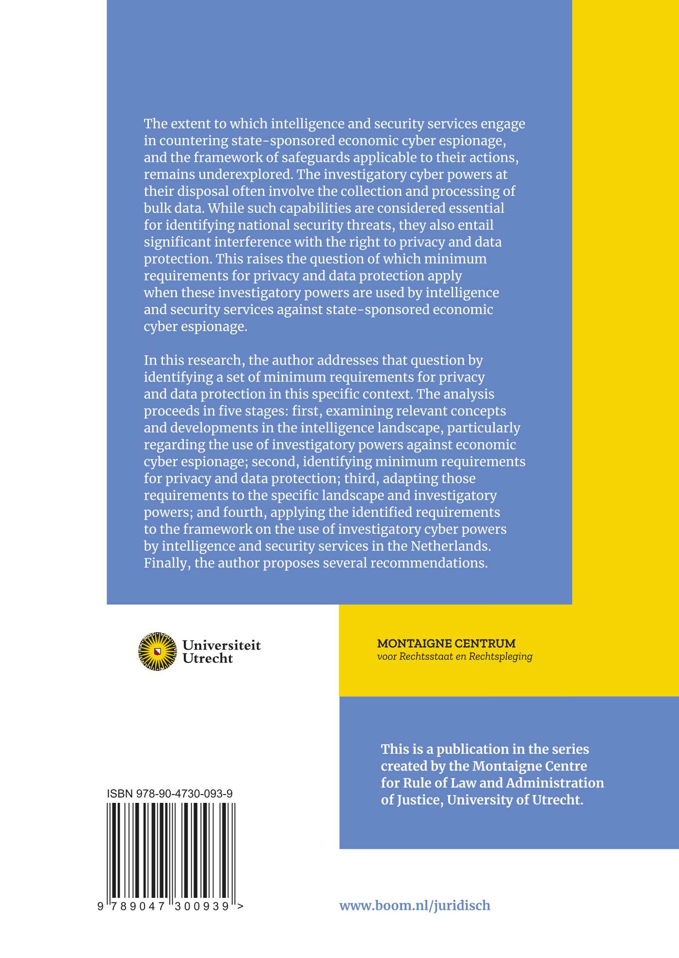 In this research, the author addresses that question by identifying a set of minimum requirements for privacy and data protection in this specific context. The analysis proceeds in five stages: first, examining relevant concepts and developments in the intelligence landscape, particularly regarding the use of investigatory powers against economic cyber espionage; second, identifying minimum requirements for privacy and data protection; third, adapting those requirements to the specific landscape and investigatory powers; and fourth, applying the identified requirements to the framework on the use of investigatory cyber powers by intelligence and security services in the Netherlands. Finally, the author proposes several recommendations.
