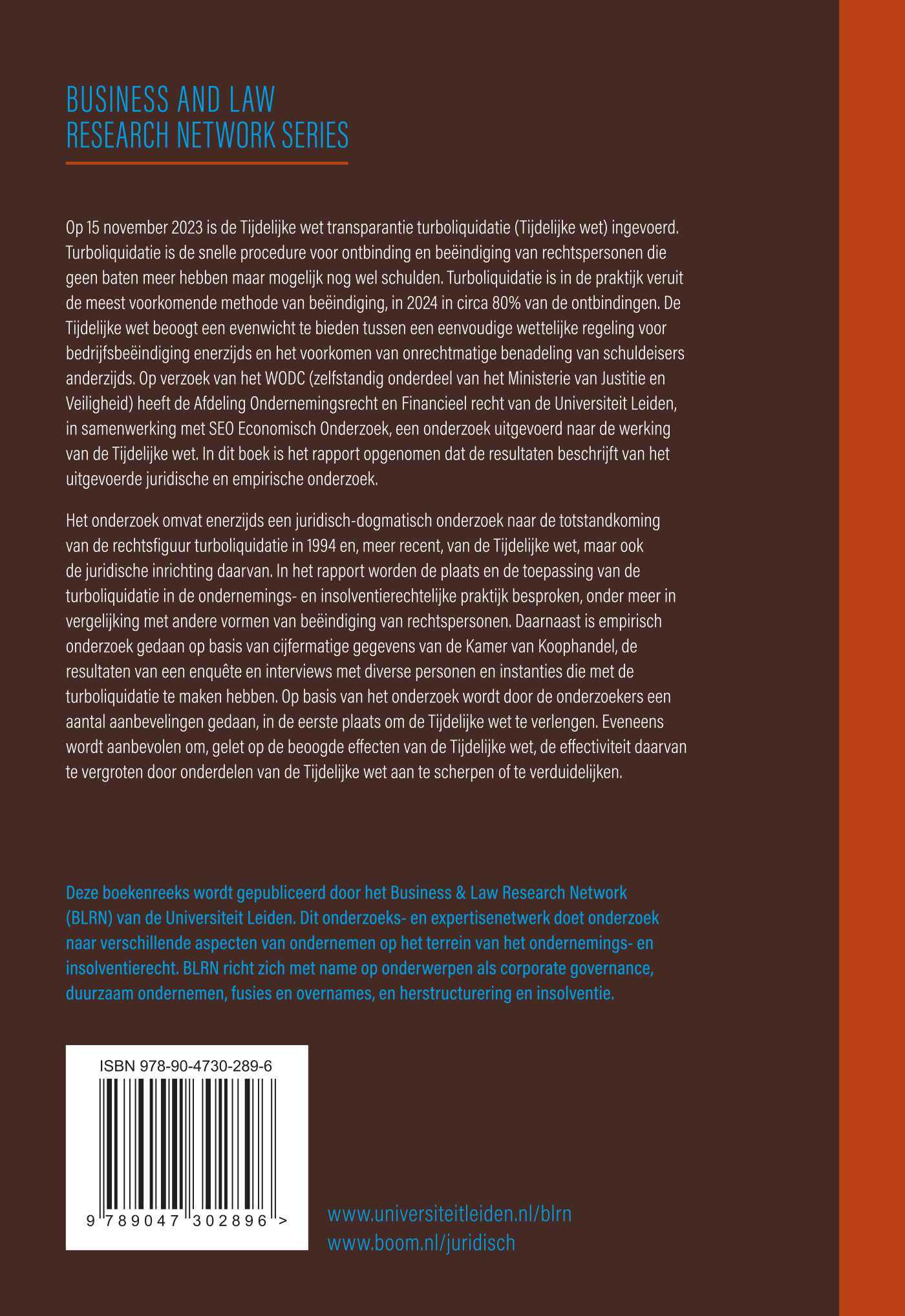 Op 15 november 2023 is de Tijdelijke wet transparantie turboliquidatie (Tijdelijke wet) ingevoerd. Turboliquidatie is de snelle procedure voor ontbinding en beëindiging van rechtspersonen die geen baten meer hebben maar mogelijk nog wel schulden. Turboliquidatie is in de praktijk veruit de meest voorkomende methode van beëindiging, in 2024 in circa 80% van de ontbindingen. De Tijdelijke wet beoogt een evenwicht te bieden tussen een eenvoudige wettelijke regeling voor bedrijfsbeëindiging enerzijds en het voorkomen van onrechtmatige benadeling van schuldeisers anderzijds. Op verzoek van het WODC (zelfstandig onderdeel van het Ministerie van Justitie en Veiligheid) heeft de Afdeling Ondernemingsrecht en Financieel recht van de Universiteit Leiden, in samenwerking met SEO Economisch Onderzoek, een onderzoek uitgevoerd naar de werking van de Tijdelijke wet. In dit boek is het rapport opgenomen dat de resultaten beschrijft van het uitgevoerde juridische en empirische onderzoek.