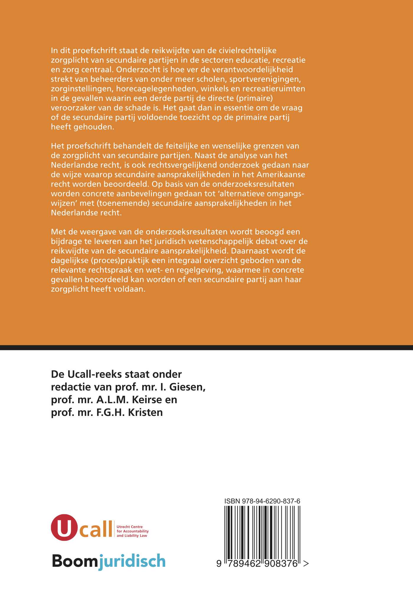 In dit proefschrift staat de reikwijdte van de civielrechtelijke zorgplicht van secundaire partijen in de sectoren educatie, recreatie en zorg centraal. Onderzocht is hoe ver de verantwoordelijkheid strekt van beheerders van onder meer scholen, sportverenigingen, zorginstellingen, horecagelegenheden, winkels en recreatieruimten in de gevallen waarin een derde partij de directe (primaire) veroorzaker van de schade is. Het gaat dan in essentie om de vraag of de secundaire partij voldoende toezicht op de primaire partij heeft gehouden.