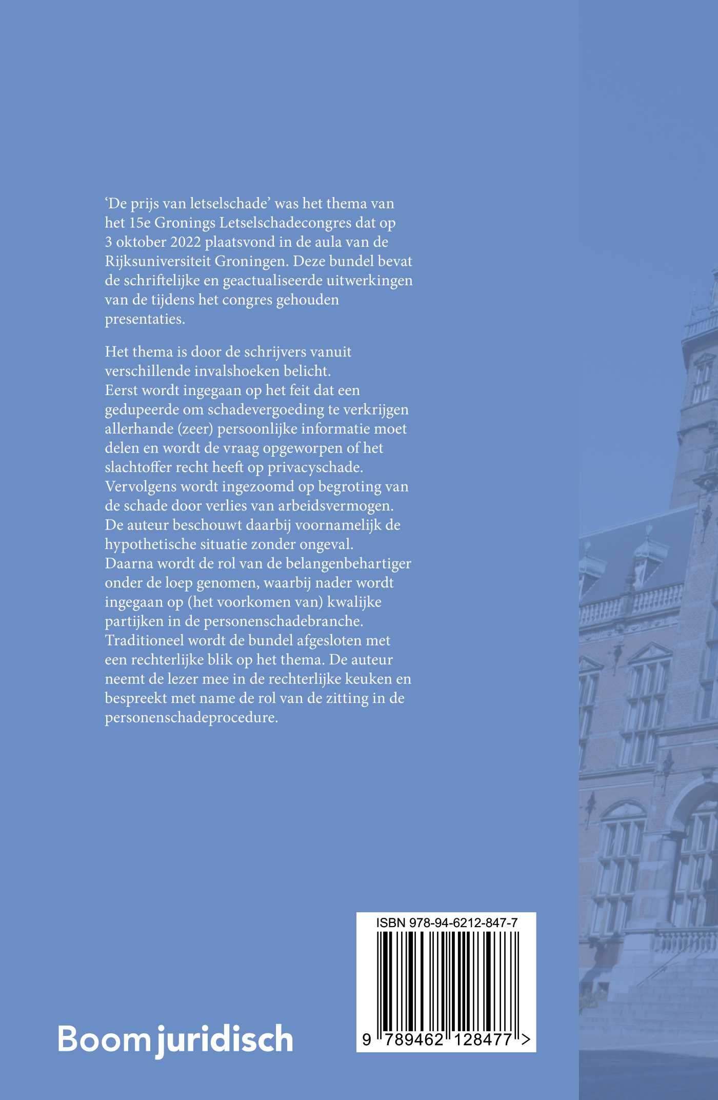 ‘De prijs van letselschade’ was het thema van het 15e Gronings Letselschadecongres dat op 3 oktober 2022 plaatsvond in de aula van de Rijksuniversiteit Groningen. Deze bundel bevat de schriftelijke en geactualiseerde uitwerkingen van de tijdens het congres gehouden presentaties.
