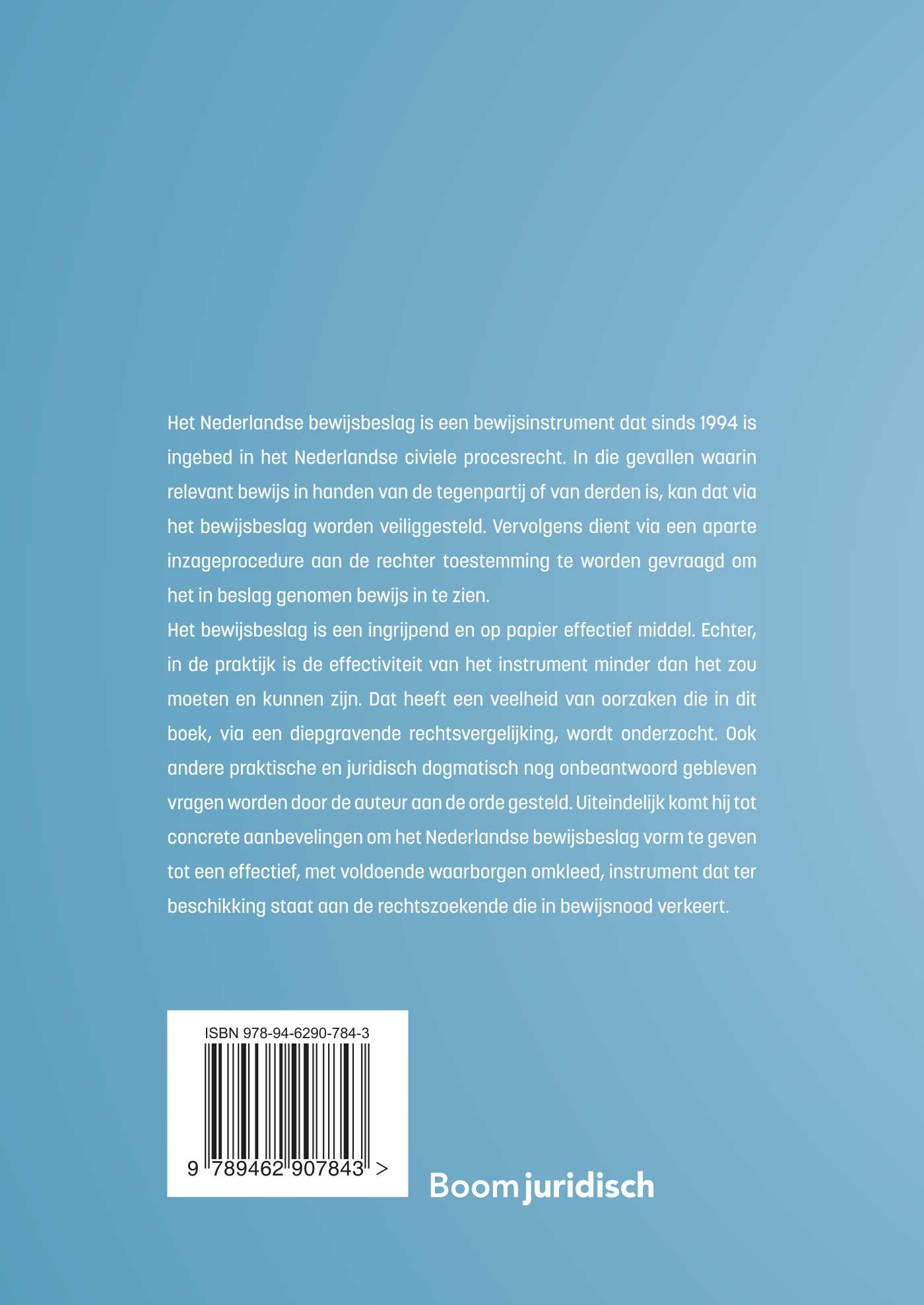 Het bewijsbeslag is een ingrijpend en op papier effectief middel. Echter, in de praktijk is de effectiviteit van het instrument minder dan het zou moeten en kunnen zijn. Dat heeft een veelheid van oorzaken die in dit boek, via een diepgravende rechtsvergelijking, wordt onderzocht. Ook andere praktische en juridisch dogmatisch nog onbeantwoord gebleven vragen worden door de auteur aan de orde gesteld. Uiteindelijk komt hij tot concrete aanbevelingen om het Nederlandse bewijsbeslag vorm te geven tot een effectief, met voldoende waarborgen omkleed, instrument dat ter beschikking staat aan de rechtszoekende die in bewijsnood verkeert.