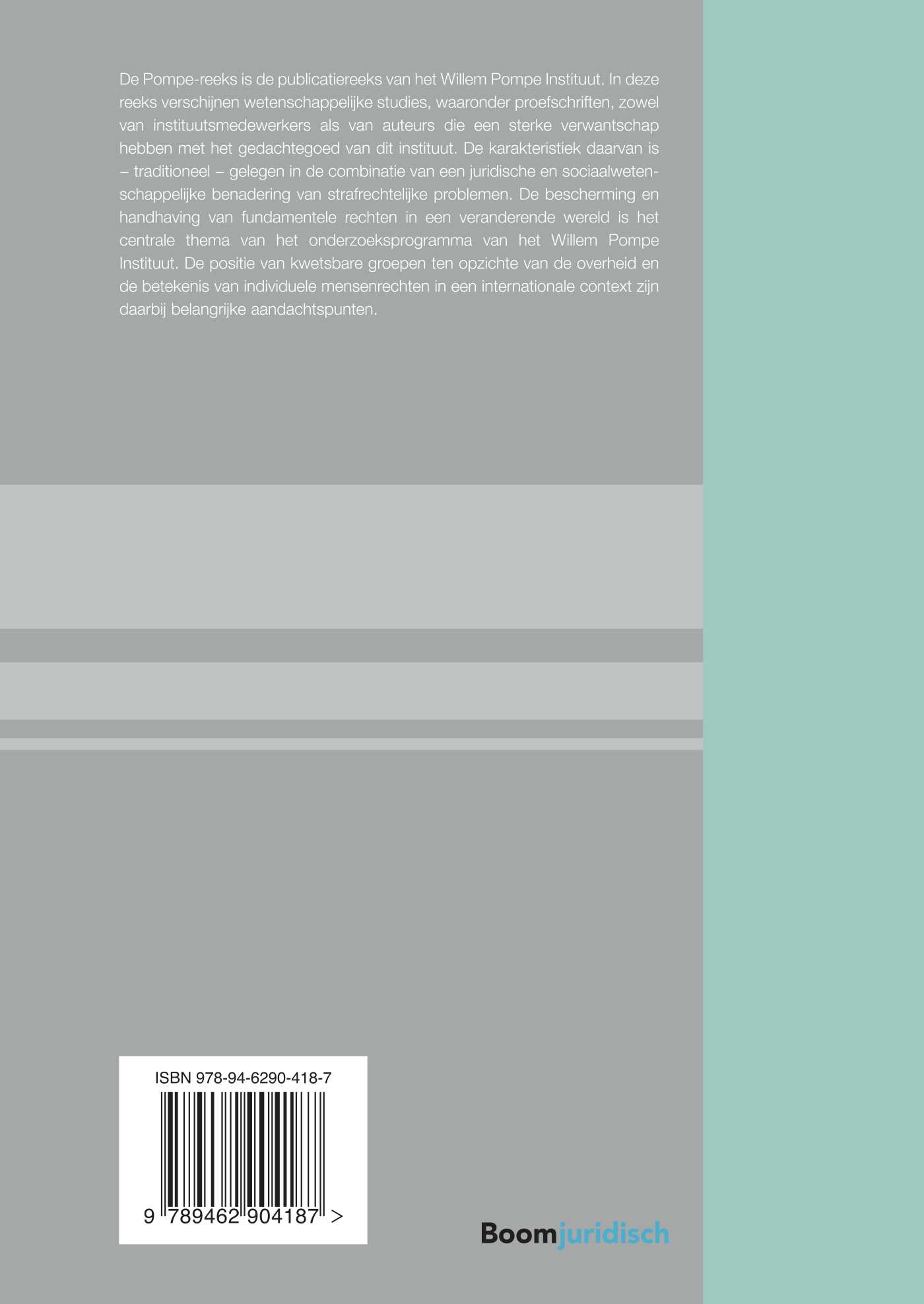 De Pompe-reeks is de publicatiereeks van het Willem Pompe Instituut. In deze reeks verschijnen wetenschappelijke studies, waaronder proefschriften, zowel van instituutsmedewerkers als van auteurs die een sterke verwantschap hebben met het gedachtegoed van dit instituut. De karakteristiek daarvan is − traditioneel − gelegen in de combinatie van een juridische en sociaalwetenschappelijke benadering van strafrechtelijke problemen. De bescherming en handhaving van fundamentele rechten in een veranderende wereld is het centrale thema van het onderzoeksprogramma van het Willem Pompe Instituut. De positie van kwetsbare groepen ten opzichte van de overheid en de betekenis van individuele mensenrechten in een internationale context zijn daarbij belangrijke aandachtspunten.