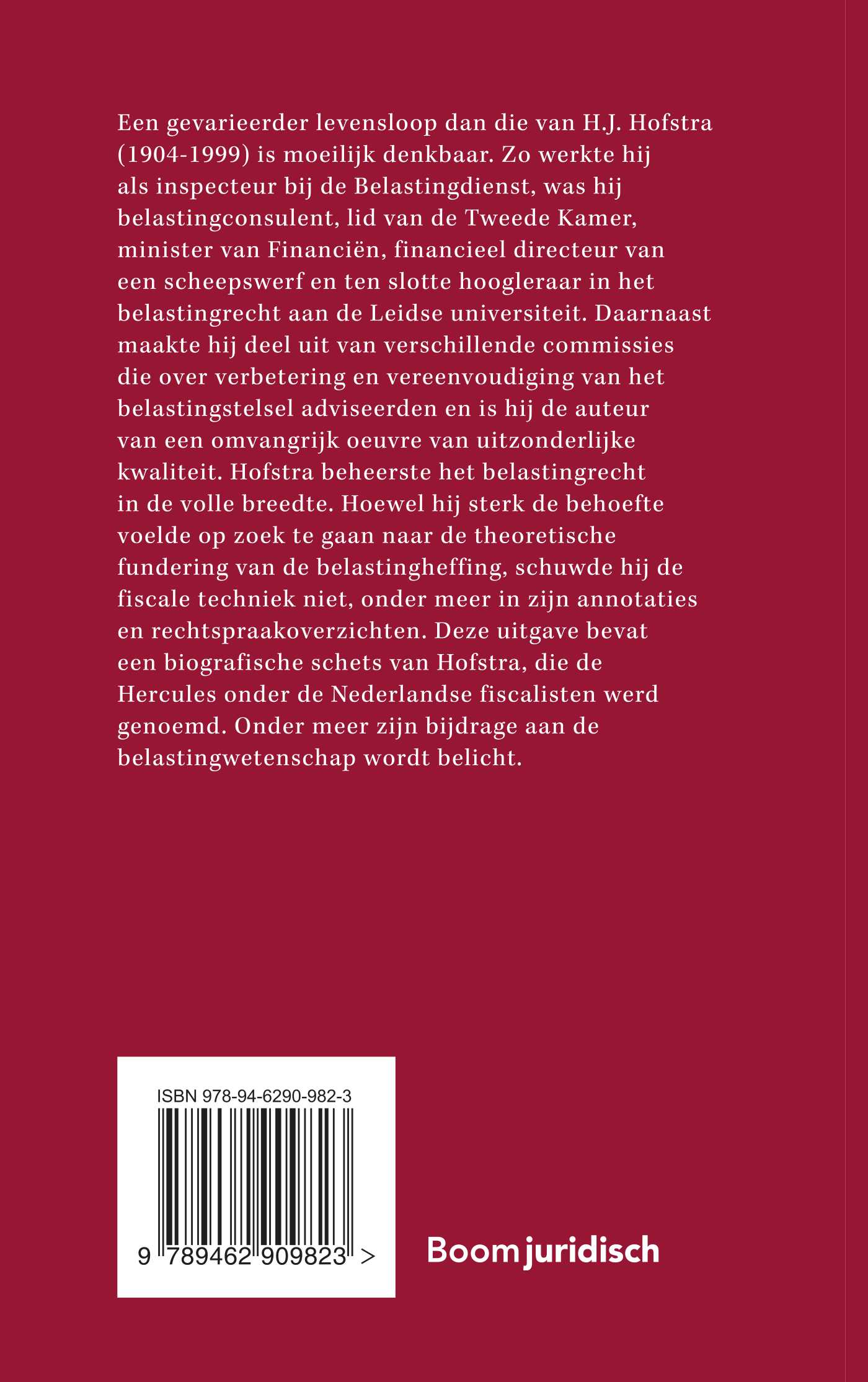 Een gevarieerder levensloop dan die van H.J. Hofstra (1904-1999) is moeilijk denkbaar. Zo werkte hij als inspecteur bij de Belastingdienst, was hij belastingconsulent, lid van de Tweede Kamer, minister van Financiën, financieel directeur van een scheepswerf en ten slotte hoogleraar in het belastingrecht aan de Leidse universiteit. Daarnaast maakte hij deel uit van verschillende commissies die over verbetering en vereenvoudiging van het belastingstelsel adviseerden en is hij de auteur van een omvangrijk oeuvre van uitzonderlijke kwaliteit. Hofstra beheerste het belastingrecht in de volle breedte. Hoewel hij sterk de behoefte voelde op zoek te gaan naar de theoretische fundering van de belastingheffing, schuwde hij de fiscale techniek niet, onder meer in zijn annotaties en rechtspraakoverzichten. Deze uitgave bevat een biografische schets van Hofstra, die de Hercules onder de Nederlandse fiscalisten werd genoemd. Onder meer zijn bijdrage aan de belastingwetenschap wordt belicht.
