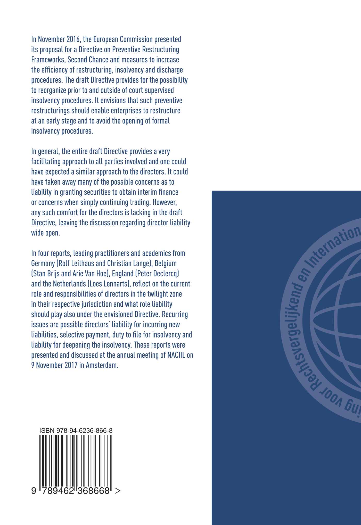 In four reports, leading practitioners and academics from Germany (Rolf Leithaus and Christian Lange), Belgium (Stan Brijs and Arie Van Hoe), England (Peter Declercq) and the Netherlands (Loes Lennarts), reflect on the current role and responsibilities of directors in the twilight zone in their respective jurisdiction and what role liability should play also under the envisioned Directive. Recurring issues are possible directors’ liability for incurring new liabilities, selective payment, duty to file for insolvency and liability for deepening the insolvency. These reports were presented and discussed at the annual meeting of NACIIL on 9 November 2017 in Amsterdam.