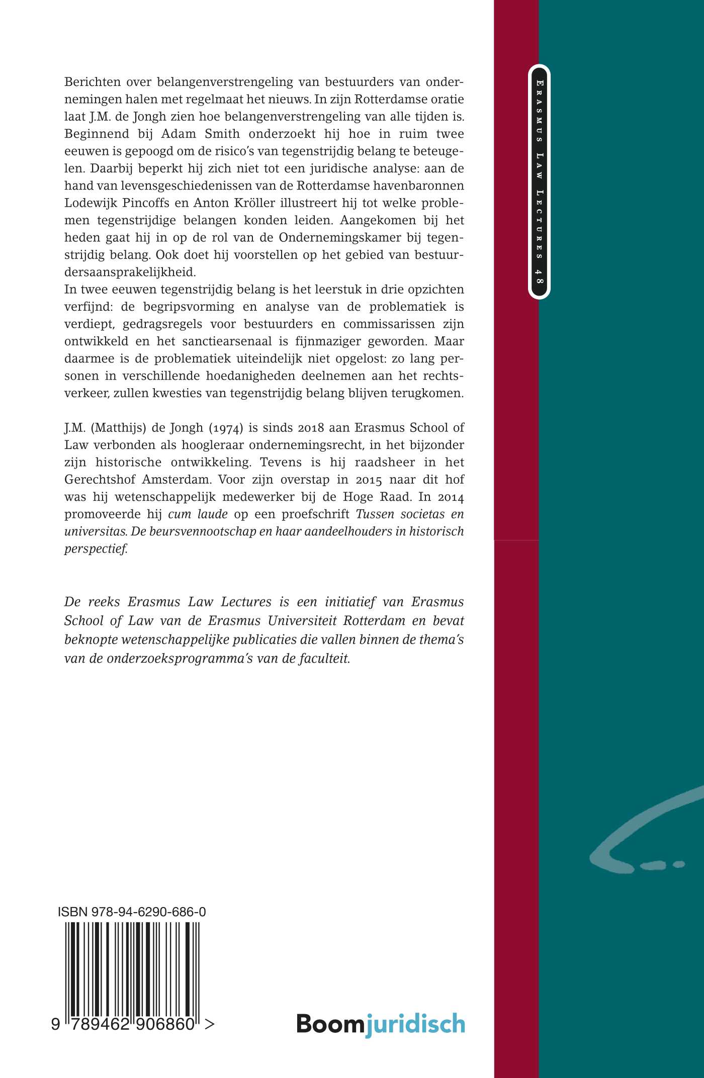 Berichten over belangenverstrengeling van bestuurders van ondernemingen halen met regelmaat het nieuws. In zijn Rotterdamse oratie laat J.M. de Jongh zien hoe belangenverstrengeling van alle tijden is. Beginnend bij Adam Smith onderzoekt hij hoe in ruim twee eeuwen is gepoogd om de risico’s van tegenstrijdig belang te beteugelen. Daarbij beperkt hij zich niet tot een juridische analyse: aan de hand van levensgeschiedenissen van de Rotterdamse havenbaronnen Lodewijk Pincoffs en Anton Kröller illustreert hij tot welke problemen tegenstrijdige belangen konden leiden. Aangekomen bij het heden gaat hij in op de rol van de Ondernemingskamer bij tegenstrijdig belang. Ook doet hij voorstellen op het gebied van bestuurdersaansprakelijkheid.