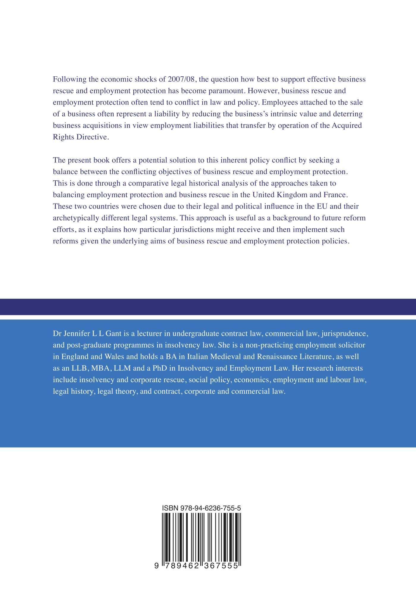 The present book offers a potential solution to this inherent policy conflict by seeking a balance between the conflicting objectives of business rescue and employment protection. This is done through a comparative legal historical analysis of the approaches taken to balancing employment protection and business rescue in the United Kingdom and France. These two countries were chosen due to their legal and political influence in the EU and their archetypically different legal systems. This approach is useful as a background to future reform efforts, as it explains how particular jurisdictions might receive and then implement such reforms given the underlying aims of business rescue and employment protection policies.