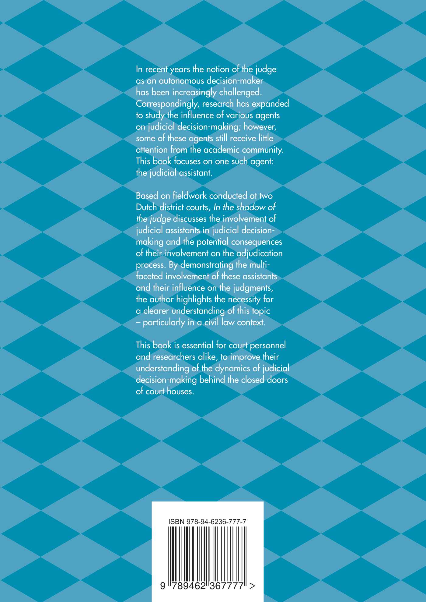Based on fieldwork conducted at two Dutch district courts, In the shadow of the judge discusses the involvement of judicial assistants in judicial decisionmaking and the potential consequences of their involvement on the adjudication process. By demonstrating the multifaceted involvement of these assistants and their influence on the judgments, the author highlights the necessity for a clearer understanding of this topic – particularly in a civil law context.