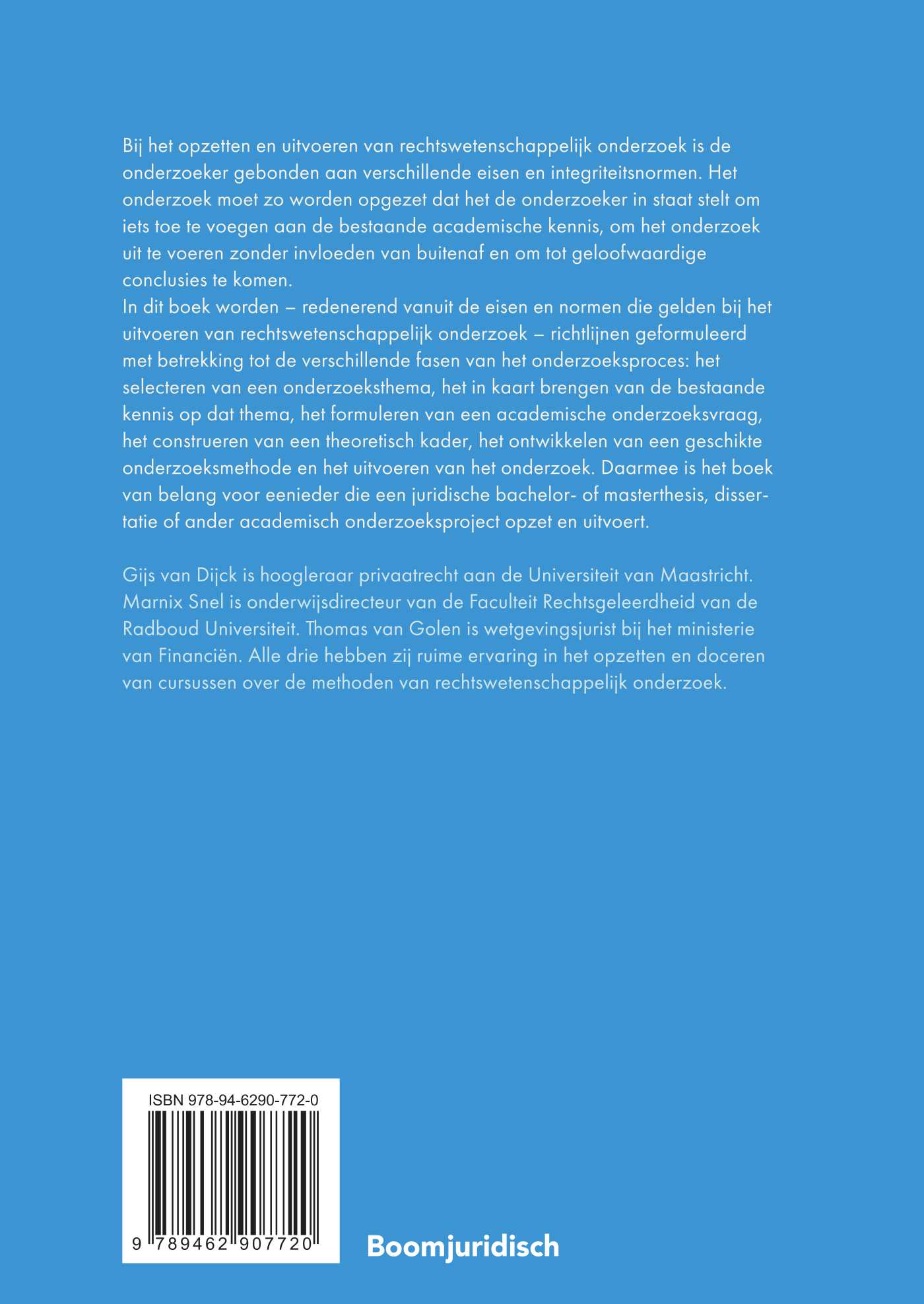 Gijs van Dijck is hoogleraar privaatrecht aan de Universiteit van Maastricht. Marnix Snel is onderwijsdirecteur van de Faculteit Rechtsgeleerdheid van de Radboud Universiteit. Thomas van Golen is wetgevingsjurist bij het ministerie van Financiën. Alle drie hebben zij ruime ervaring in het opzetten en doceren van cursussen over de methoden van rechtswetenschappelijk onderzoek.