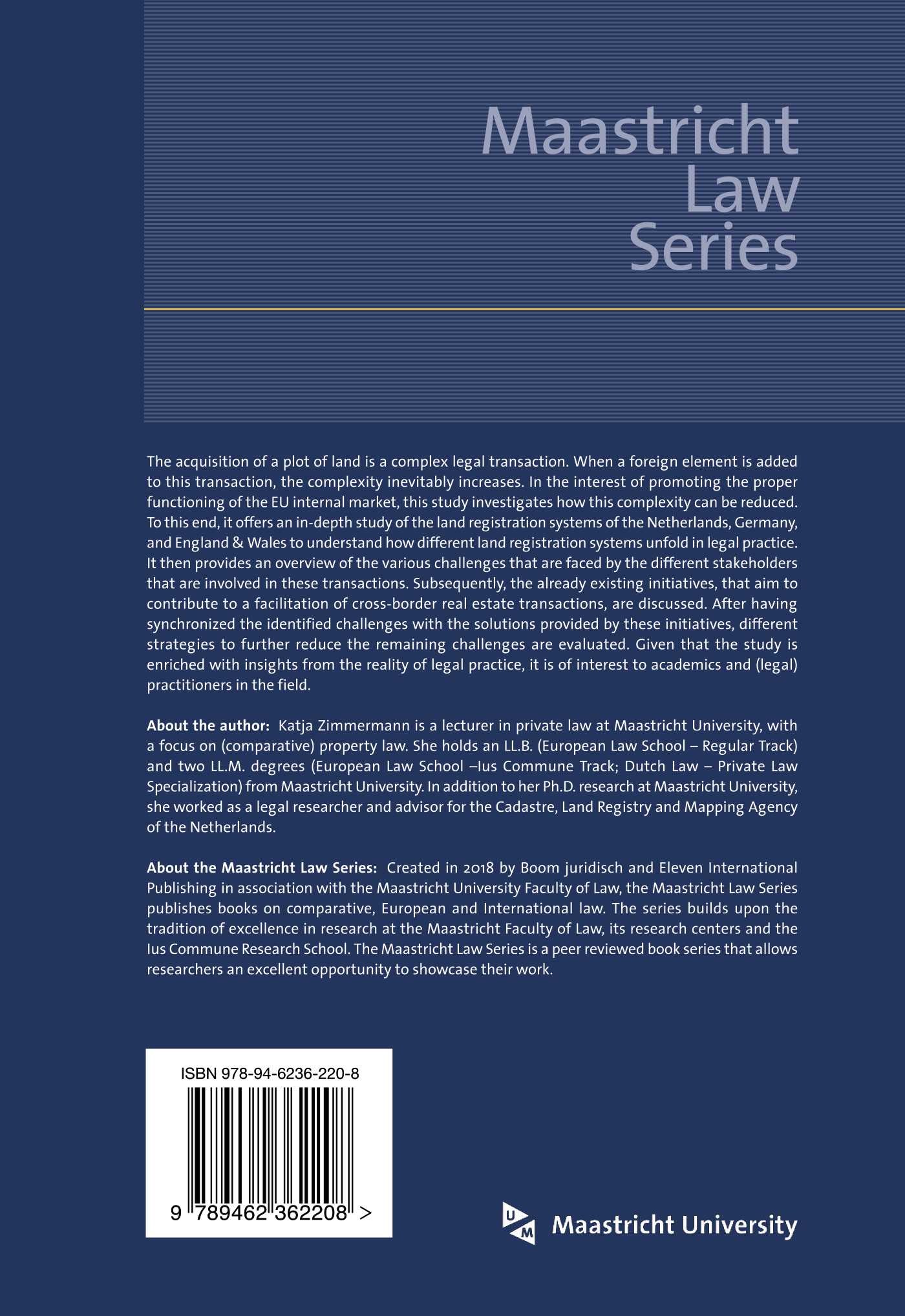 The acquisition of a plot of land is a complex legal transaction. When a foreign element is added to this transaction, the complexity inevitably increases. In the interest of promoting the proper functioning of the EU internal market, this study investigates how this complexity can be reduced. To this end, it offers an in-depth study of the land registration systems of the Netherlands, Germany, and England & Wales to understand how differentland registration systems unfold in legal practice. It then provides an overview of the various challenges that are faced by the different stakeholders that are involved in these transactions. Subsequently, the already existing initiatives, that aim to contribute to a facilitation of cross-border real estate transactions, are discussed. After having synchronized the identified challenges with the solutions provided by these initiatives, different strategies to further reduce the remaining challenges are evaluated. Given that the study is enriched with insights from the reality of legal practice, it is of interest to academics and (legal) practitioners in the field.