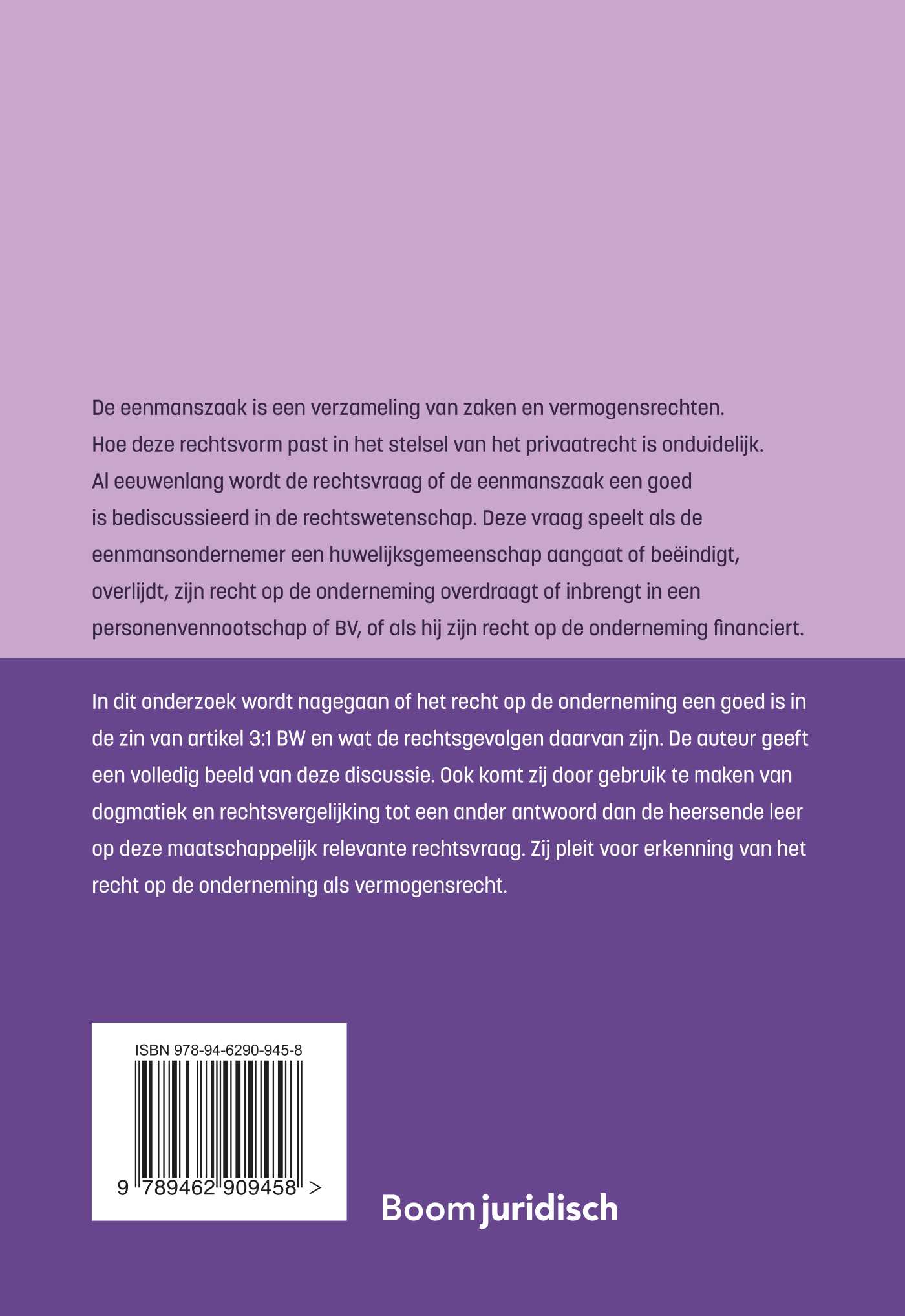 In dit onderzoek wordt nagegaan of het recht op de onderneming een goed is in de zin van artikel 3:1 BW en wat de rechtsgevolgen daarvan zijn. De auteur geeft een volledig beeld van deze discussie. Ook komt zij door gebruik te maken van dogmatiek en rechtsvergelijking tot een ander antwoord dan de heersende leer op deze maatschappelijk relevante rechtsvraag. Zij pleit voor erkenning van het recht op de onderneming als vermogensrecht.