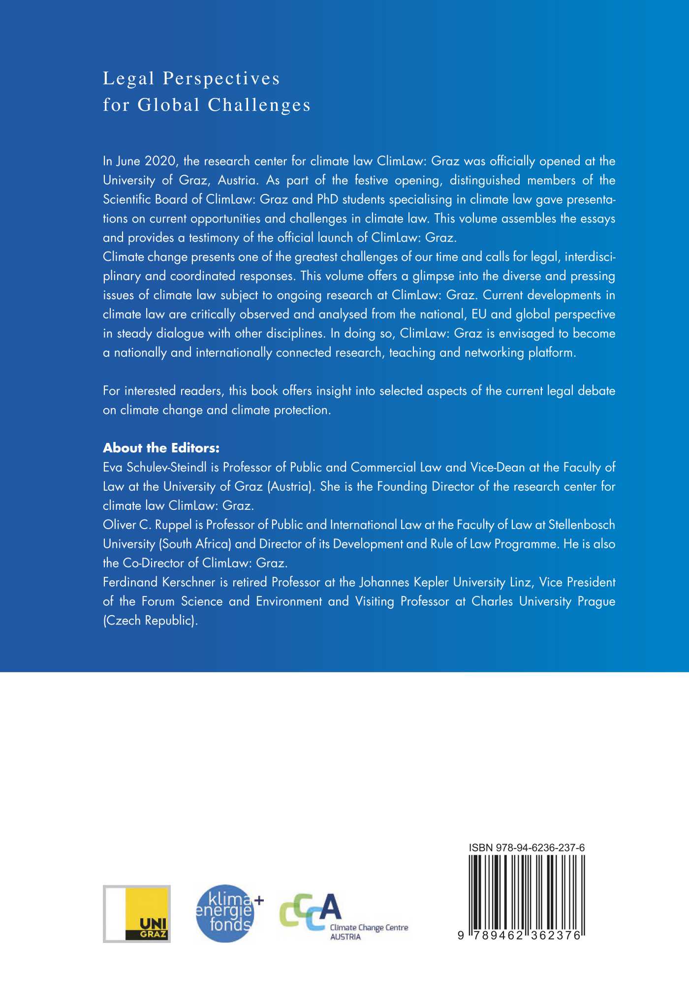 In June 2020, the research center for climate law ClimLaw: Graz was officially opened at the University of Graz, Austria. As part of the festive opening, distinguished members of the Scientific Board of ClimLaw: Graz and PhD students specialising in climate law gave presentations on current opportunities and challenges in climate law. This volume assembles the essays and provides a testimony of the official launch of ClimLaw: Graz. Climate change presents one of the greatest challenges of our time and calls for legal, interdisciplinary and coordinated responses. This volume offers a glimpse into the diverse and pressing issues of climate law subject to ongoing research at ClimLaw: Graz.