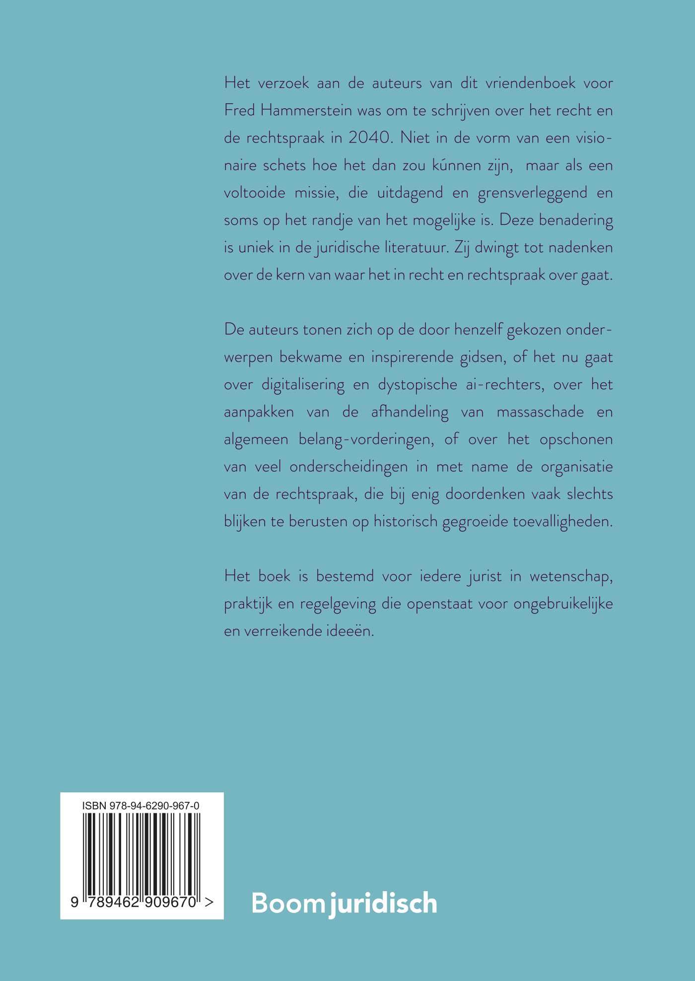Het verzoek aan de auteurs van dit vriendenboek voor Fred Hammerstein was om te schrijven over het recht en de rechtspraak in 2040. Niet in de vorm van een visionaire schets hoe het dan zou kúnnen zijn, maar als een vol tooide missie, die uitdagend en grensverleggend en soms op het randje van het mogelijke is. Deze benadering is uniek in de juridische literatuur. Zij dwingt tot nadenken over de kern van waar het in recht en rechtspraak over gaat.