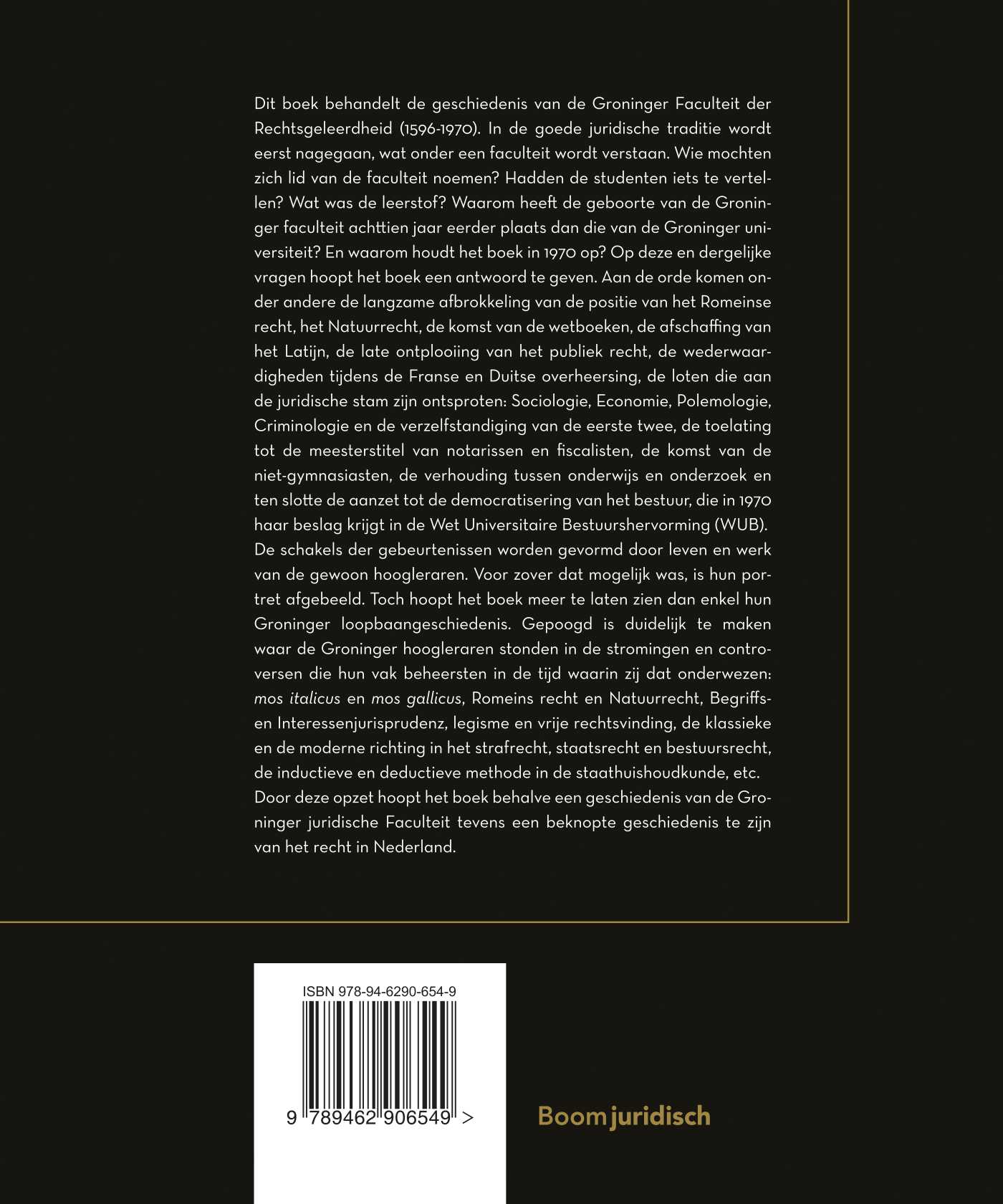 Dit boek behandelt de geschiedenis van de Groninger Faculteit der Rechtsgeleerdheid (1596-1970). In de goede juridische traditie wordt eerst nagegaan, wat onder een faculteit wordt verstaan. Wie mochten zich lid van de faculteit noemen? Hadden de studenten iets te vertellen? Wat was de leerstof? Waarom heeft de geboorte van de Groninger faculteit achttien jaar eerder plaats dan die van de Groninger universiteit? En waarom houdt het boek in 1970 op? Op deze en dergelijke vragen hoopt het boek een antwoord te geven. Aan de orde komen onder andere de langzame afbrokkeling van de positie van het Romeinse recht, het Natuurrecht, de komst van de wetboeken, de afschaffing van het Latijn, de late ontplooiing van het publiek recht, de wederwaardigheden tijdens de Franse en Duitse overheersing, de loten die aan de juridische stam zijn ontsproten: Sociologie, Economie, Polemologie, Criminologie en de verzelfstandiging van de eerste twee, de toelating tot de meesterstitel van notarissen en fiscalisten, de komst van de niet-gymnasiasten, de verhouding tussen onderwijs en onderzoek en ten slotte de aanzet tot de democratisering van het bestuur, die in 1970 haar beslag krijgt in de Wet Universitaire Bestuurshervorming (WUB). De schakels der gebeurtenissen worden gevormd door leven en werk van de gewoon hoogleraren. Voor zover dat mogelijk was, is hun portret afgebeeld. Toch hoopt het boek meer te laten zien dan enkel hun Groninger loopbaangeschiedenis. Gepoogd is duidelijk te maken waar de Groninger hoogleraren stonden in de stromingen en controversen die hun vak beheersten in de tijd waarin zij dat onderwezen: mos italicus en mos gallicus, Romeins recht en Natuurrecht, Begriffsen Interessenjurisprudenz, legisme en vrije rechtsvinding, de klassieke en de moderne richting in het strafrecht, staatsrecht en bestuursrecht, de inductieve en deductieve methode in de staathuishoudkunde, etc. Door deze opzet hoopt het boek behalve een geschiedenis van de Groninger juridische Faculteit tevens een beknopte geschiedenis te zijn van het recht in Nederland.