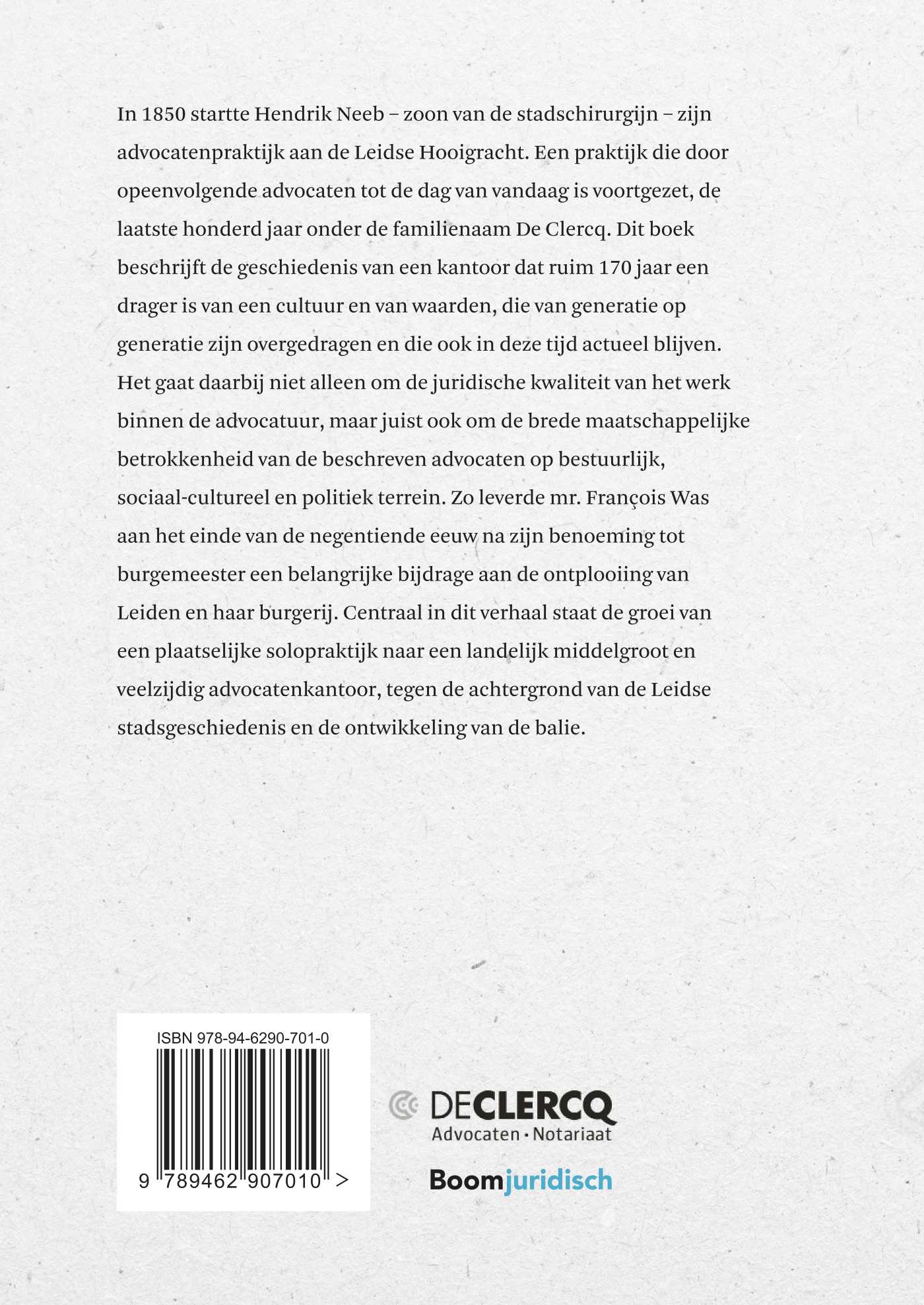 In 1850 startte Hendrik Neeb – zoon van de stadschirurgijn – zijn SPREKEN DAT BONDIG IS advocatenpraktijk aan de Leidse Hooigracht. Een praktijk die door opeenvolgende advocaten tot de dag van vandaag is voortgezet, de laatste honderd jaar onder de familienaam De Clercq. Dit boek beschrijft de geschiedenis van een kantoor dat ruim 170 jaar een drager is van een cultuur en van waarden, die van generatie op generatie zijn overgedragen en die ook in deze tijd actueel blijven. Het gaat daarbij niet alleen om de juridische kwaliteit van het werk binnen de advocatuur, maar juist ook om de brede maatschappelijke betrokkenheid van de beschreven advocaten op bestuurlijk, sociaal-cultureel en politiek terrein. Zo leverde mr. François Was aan het einde van de negentiende eeuw na zijn benoeming tot burgemeester een belangrijke bijdrage aan de ontplooiing van Leiden en haar burgerij. Centraal in dit verhaal staat de groei van een plaatselijke solopraktijk naar een landelijk middelgroot en veelzijdig advocatenkantoor, tegen de achtergrond van de Leidse stadsgeschiedenis en de ontwikkeling van de balie.
