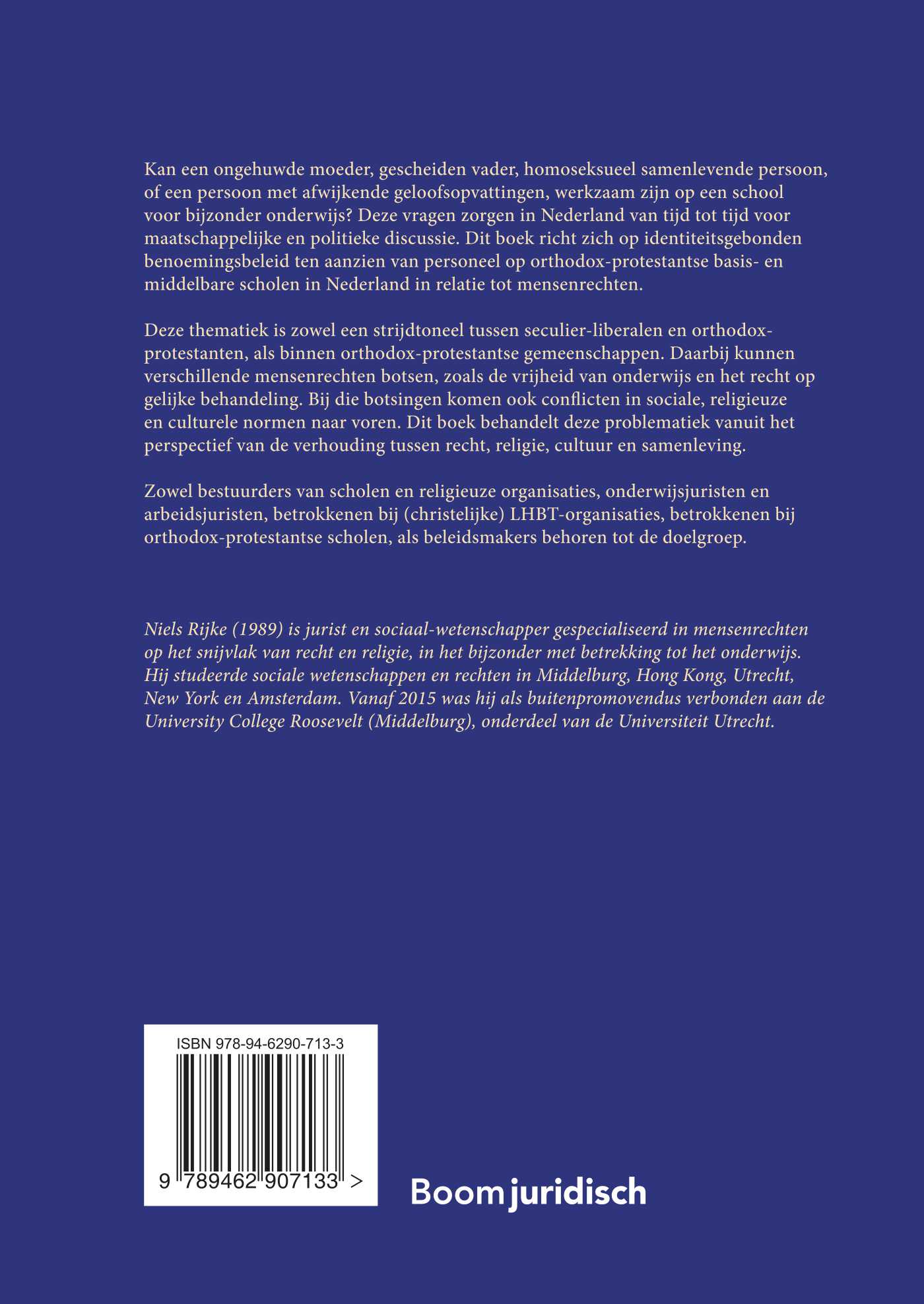 Kan een ongehuwde moeder, gescheiden vader, homoseksueel samenlevende persoon, of een persoon met afwijkende geloofsopvattingen, werkzaam zijn op een school voor bijzonder onderwijs? Deze vragen zorgen in Nederland van tijd tot tijd voor maatschappelijke en politieke discussie. Dit boek richt zich op identiteitsgebonden benoemingsbeleid ten aanzien van personeel op orthodox-protestantse basis- en middelbare scholen in Nederland in relatie tot mensenrechten.