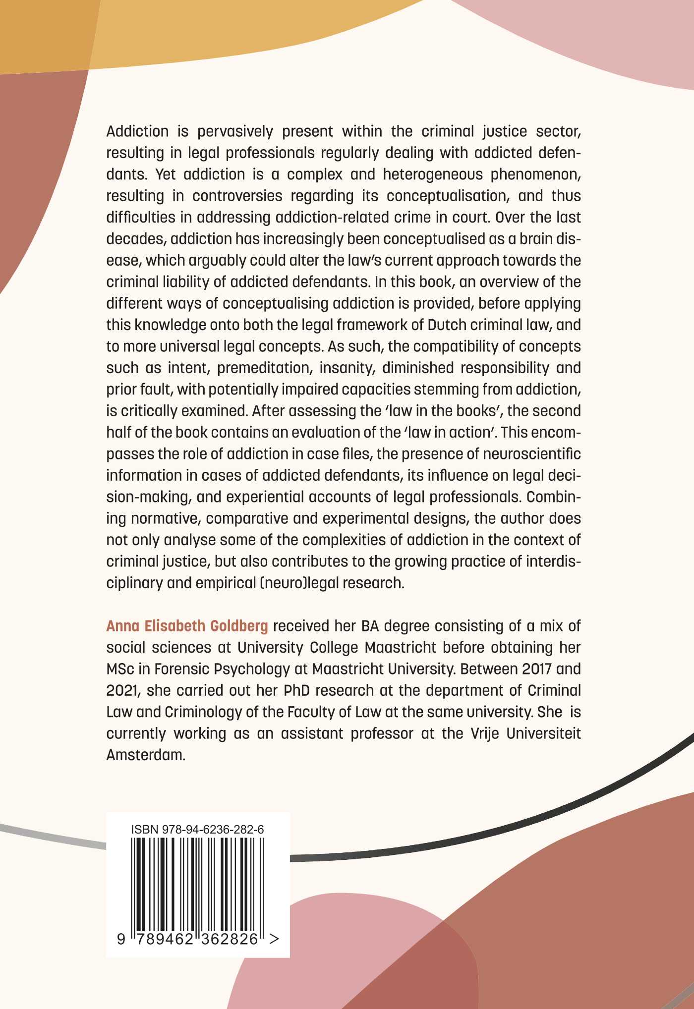 Addiction is pervasively present within the criminal justice sector, resulting in legal professionals regularly dealing with addicted defendants. Yet addiction is a complex and heterogeneous phenomenon, resulting in controversies regarding its conceptualisation, and thus difficulties in addressing addiction-related crime in court. Over the last decades, addiction has increasingly been conceptualised as a brain disease, which arguably could alter the law’s current approach towards the criminal liability of addicted defendants. In this book, an overview of the different ways of conceptualising addiction is provided, before applying this knowledge onto both the legal framework of Dutch criminal law, and to more universal legal concepts. As such, the compatibility of concepts such as intent, premeditation, insanity, diminished responsibility and prior fault, with potentially impaired capacities stemming from addiction, is critically examined. After assessing the ‘law in the books’, the second half of the book contains an evaluation of the ‘law in action’. This encompasses the role of addiction in case files, the presence of neuroscientific information in cases of addicted defendants, its influence on legal decision-making, and experiential accounts of legal professionals. Combining normative, comparative and experimental designs, the author does not only analyse some of the complexities of addiction in the context of criminal justice, but also contributes to the growing practice of interdisciplinary and empirical (neuro)legal research.