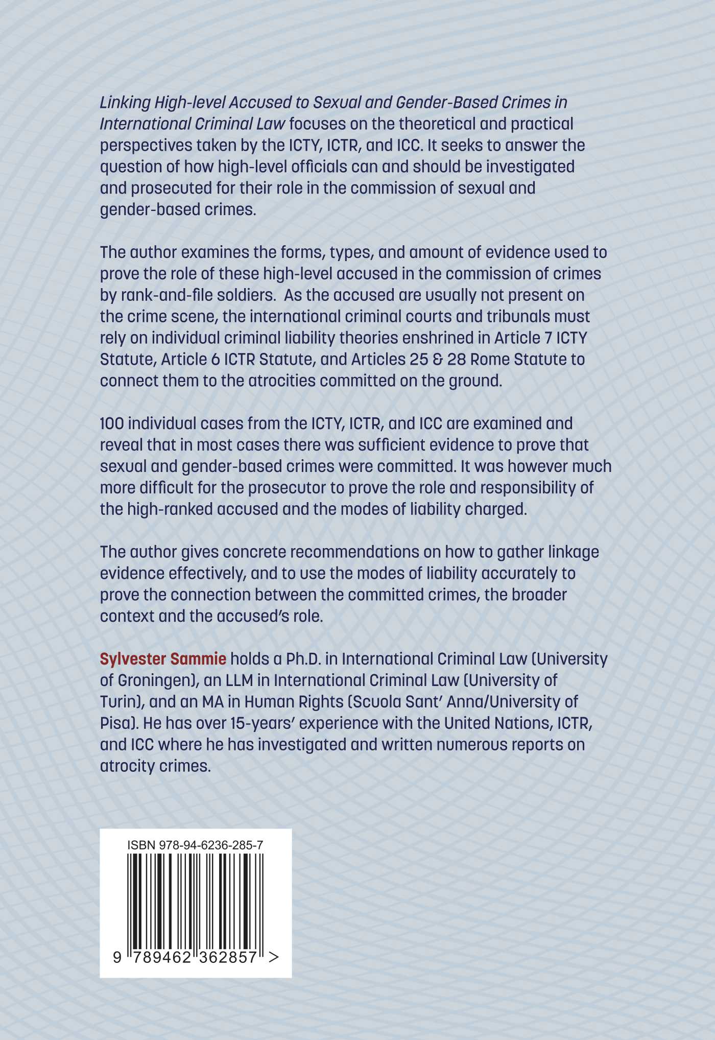 Linking High-level Accused to Sexual and Gender-Based Crimes in International Criminal Law focuses on the theoretical and practical perspectives taken by the ICTY, ICTR, and ICC. It seeks to answer the question of how high-level officials can and should be investigated and prosecuted for their role in the commission of sexual and gender-based crimes.