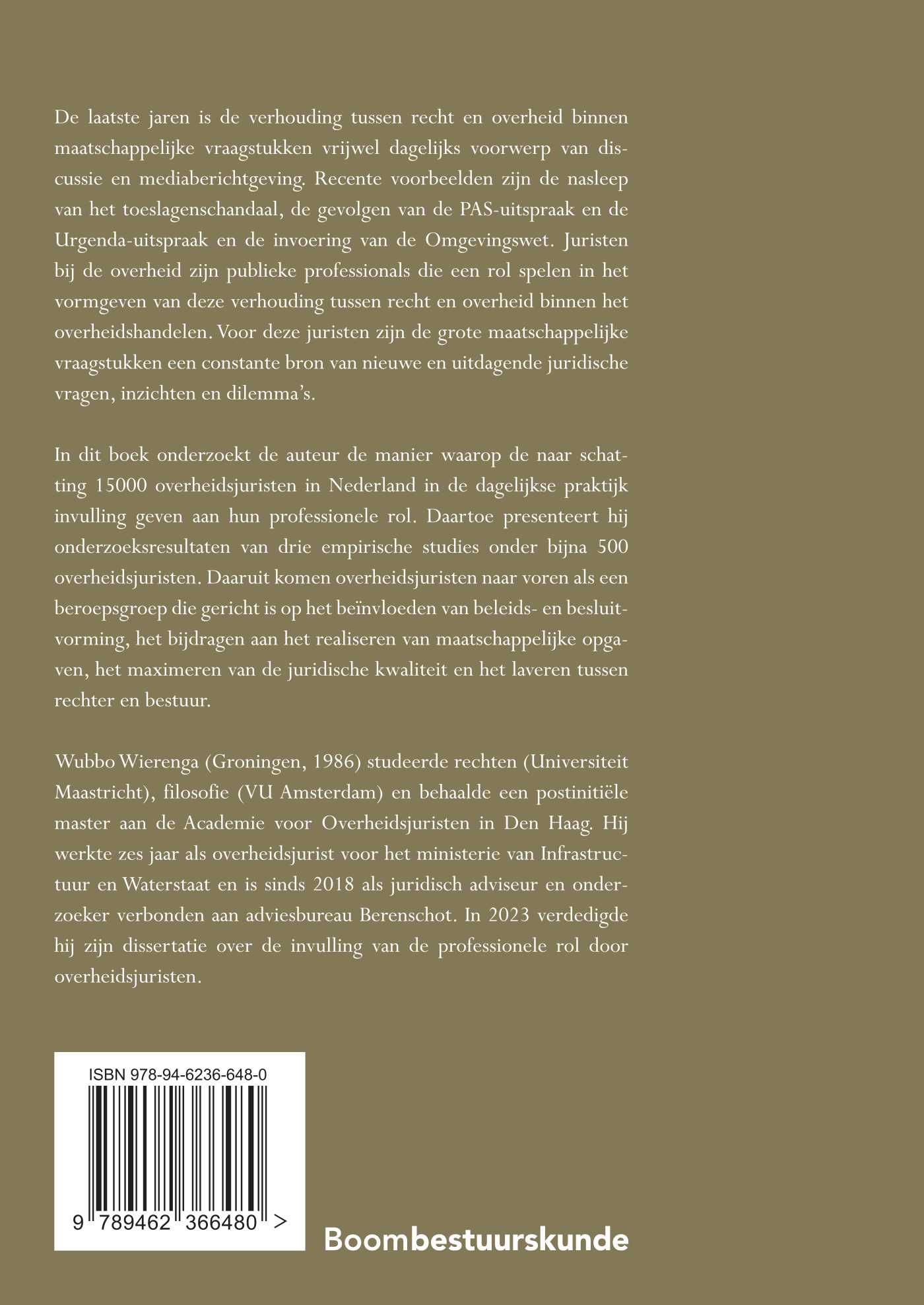 In dit boek onderzoekt de auteur de manier waarop de naar schatting 15000 overheidsjuristen in Nederland in de dagelijkse praktijk invulling geven aan hun professionele rol. Daartoe presenteert hij onderzoeksresultaten van drie empirische studies onder bijna 500 overheidsjuristen. Daaruit komen overheidsjuristen naar voren als een beroepsgroep die gericht is op het beïnvloeden van beleids- en besluitvorming, het bijdragen aan het realiseren van maatschappelijke opgaven, het maximeren van de juridische kwaliteit en het laveren tussen rechter en bestuur.