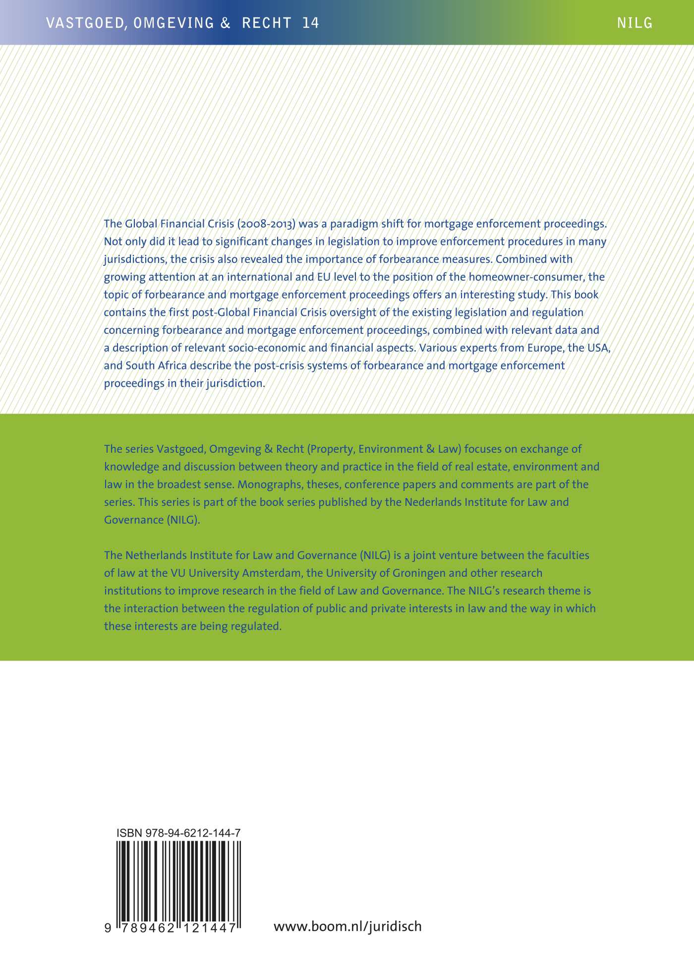 The series Vastgoed, Omgeving & Recht (Property, Environment & Law) focuses on exchange of knowledge and discussion between theory and practice in the field of real estate, environment and law in the broadest sense. Monographs, theses, conference papers and comments are part of the series. This series is part of the book series published by the Nederlands Institute for Law and Governance (NILG).