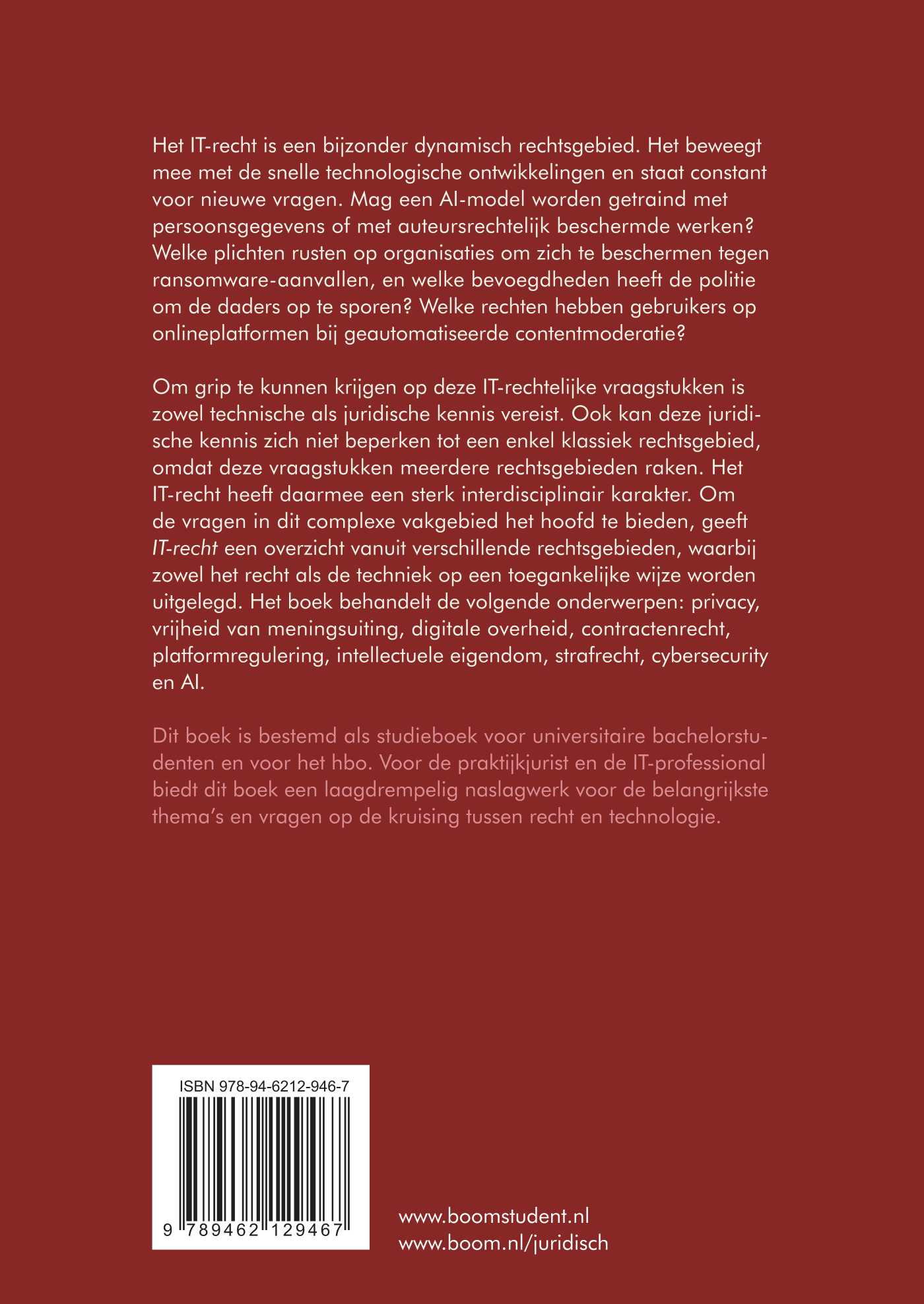 Om grip te kunnen krijgen op deze IT-rechtelijke vraagstukken is zowel technische als juridische kennis vereist. Ook kan deze juridische kennis zich niet beperken tot een enkel klassiek rechtsgebied, omdat deze vraagstukken meerdere rechtsgebieden raken. Het IT-recht heeft daarmee een sterk interdisciplinair karakter. Om de vragen in dit complexe vakgebied het hoofd te bieden, geeft IT-recht een overzicht vanuit verschillende rechtsgebieden, waarbij zowel het recht als de techniek op een toegankelijke wijze worden uitgelegd. Het boek behandelt de volgende onderwerpen: privacy, vrijheid van meningsuiting, digitale overheid, contractenrecht, platformregulering, intellectuele eigendom, strafrecht, cybersecurity en AI.