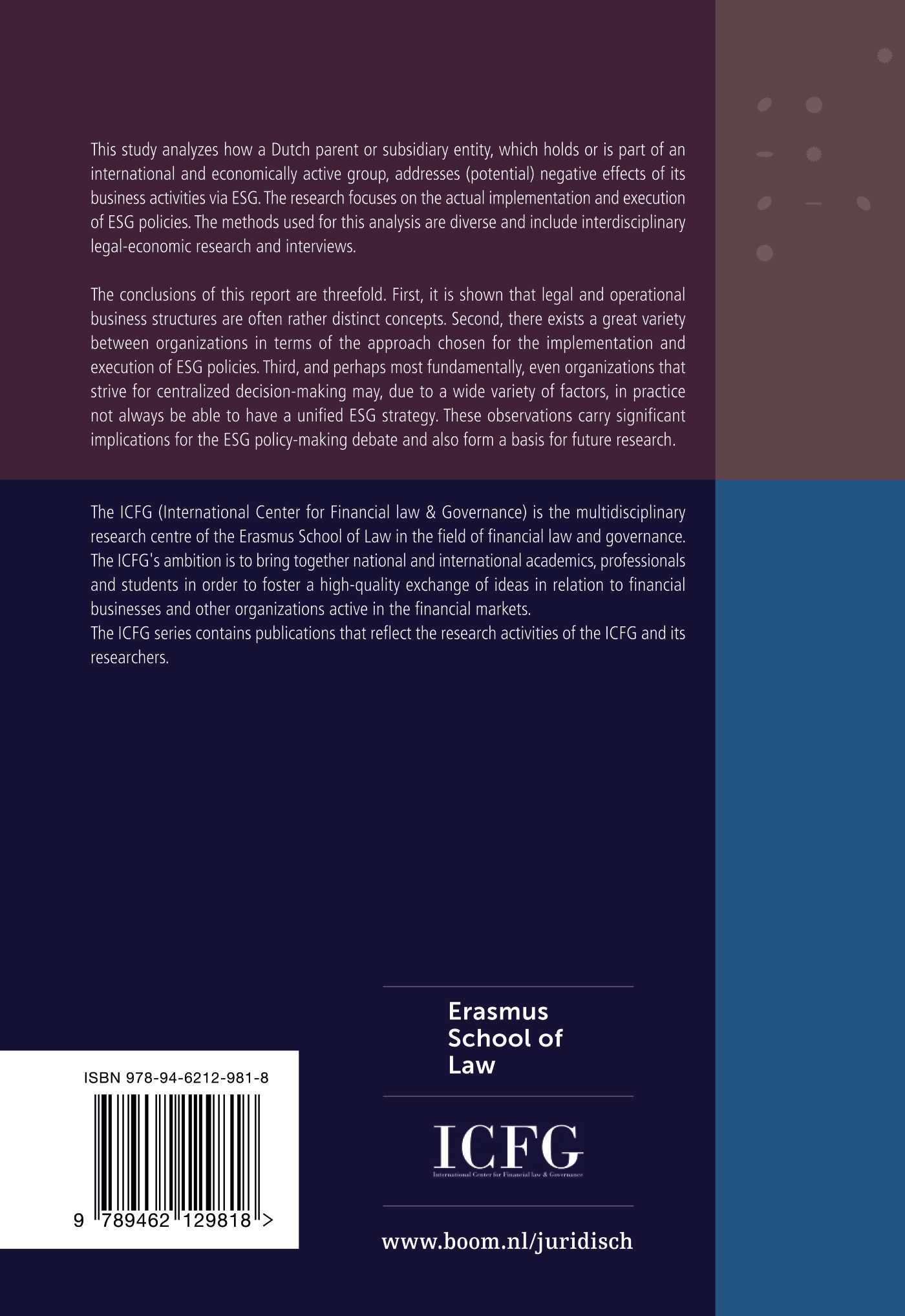 Deze Engelstalige studie analyseert hoe Nederlandse moeder- of dochterondernemingen, die deel uitmaken van een internationaal en economisch actief concern, mogelijke negatieve effecten van hun bedrijfsactiviteiten aanpakken via ESG (Environmental, Social, Governance). Het onderzoek richt zich op de daadwerkelijke implementatie en uitvoering van ESG-beleid. De gebruikte methoden voor deze analyse zijn divers en omvatten interdisciplinair juridisch-economisch onderzoek en interviews.