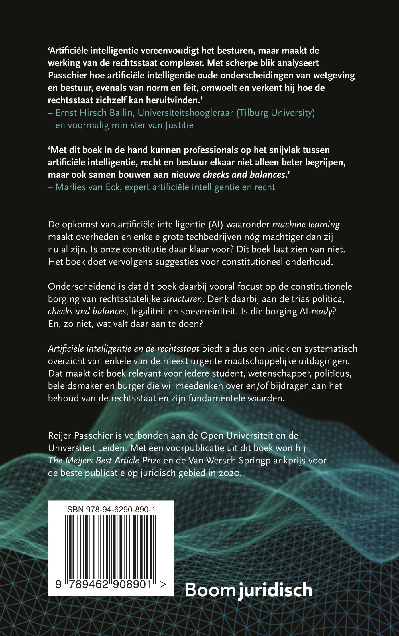 ‘Artificiële intelligentie vereenvoudigt het besturen, maar maakt de werking van de rechtsstaat complexer. Met scherpe blik analyseert Passchier hoe artificiële intelligentie oude onderscheidingen van wetgeving en bestuur, evenals van norm en feit, omwoelt en verkent hij hoe de rechtsstaat zichzelf kan heruitvinden.’ – Ernst Hirsch Ballin, Universiteitshoogleraar (Tilburg University) en voormalig minister van Justitie
