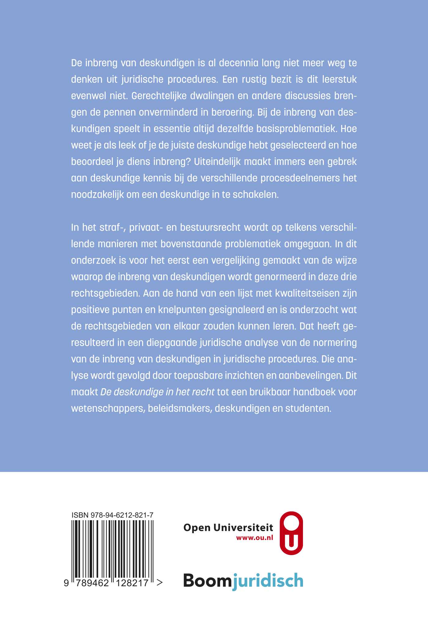 In het straf-, privaat- en bestuursrecht wordt op telkens verschillende manieren met bovenstaande problematiek omgegaan. In dit onderzoek is voor het eerst een vergelijking gemaakt van de wijze waarop de inbreng van deskundigen wordt genormeerd in deze drie rechtsgebieden. Aan de hand van een lijst met kwaliteitseisen zijn positieve punten en knelpunten gesignaleerd en is onderzocht wat de rechtsgebieden van elkaar zouden kunnen leren. Dat heeft geresulteerd in een diepgaande juridische analyse van de normering van de inbreng van deskundigen in juridische procedures. Die analyse wordt gevolgd door toepasbare inzichten en aanbevelingen. Dit maakt De deskundige in het recht tot een bruikbaar handboek voor wetenschappers, beleidsmakers, deskundigen en studenten.