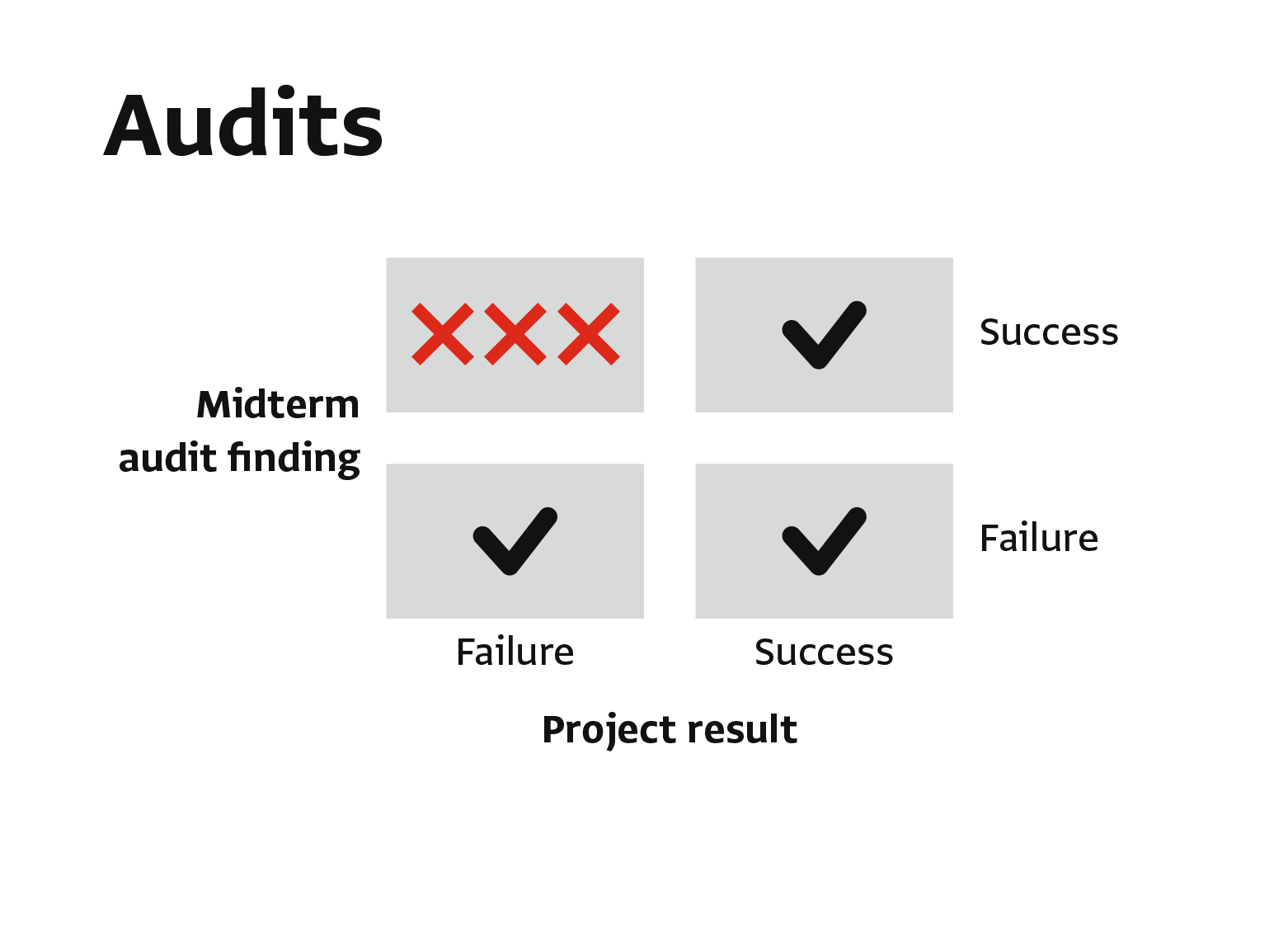 Als er halverwege een project een audit op het project gedaan wordt, zal de uitkomst altijd zijn dat het project in de gevarenzone zit en niet succesvol zal zijn. De reden hiervoor is eenvoudig. Als de auditor dit namelijk zegt, zit hij/ zij altijd goed. Als het project fout gaat, heeft de auditor dit voorspeld. Als het toch succesvol wordt, dan is er goed geluisterd. Maar o wee als de auditor zou aangeven dat het project succesvol zal zijn. Als het dan toch fout gaat, dan heeft hij/zij halverwege ten onrechte gezegd dat het goed zou komen. Dat kan hem zwaar aangerekend worden. Dus je weet de uitkomst van een audit halverwege het traject al. Een auditor is ook maar een mens.