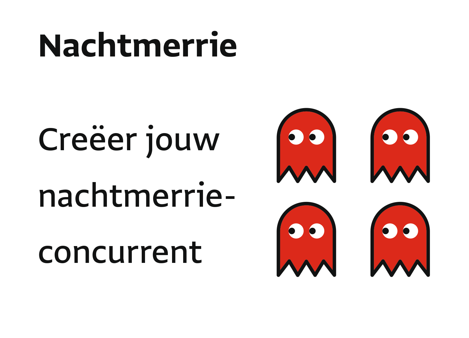 Sterke oefening in het kader van planvorming en strategievorming: creëer je eigen ‘nachtmerrie’. Wat zou een concurrent kunnen doen om het jouw organisatie moeilijk te maken? Als je dit doet met je team, ontstaat er een interessant beeld. Het laat je eigen zwakke plekken als organisatie zien. Het geeft aan waar je als organisatie (veel) beter in moet worden. Wie is jouw ‘nightmare competitor’?