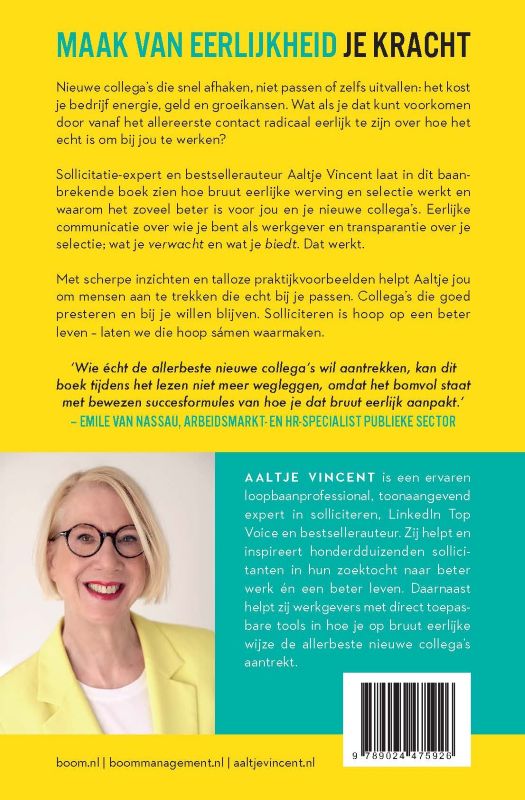 Sollicitatie-expert en bestsellerauteur Aaltje Vincent laat in dit baanbrekende boek zien hoe bruut eerlijke werving en selectie werkt en waarom het zoveel beter is voor jou en je nieuwe collega’s. Eerlijke communicatie over wie je bent als werkgever en transparantie over je selectie; wat je verwacht en wat je biedt. Dat werkt.
