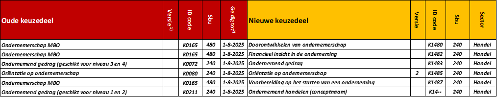 Naast de vakspecifieke opleidingen biedt een aantal keuzedelen op het gebied van ondernemerschap de student ook de mogelijkheid om zich te ontwikkelen op het gebied van ondernemerschap. Dit loopt uiteen van ondernemend gedrag tot het opzetten van je eigen onderneming. In 2025 verandert er veel binnen het SBB-aanbod van keuzedelen ondernemerschap. De vier bestaande keuzedelen maken plaats voor zes nieuwe! Zie hieronder de conversietabel van SBB.