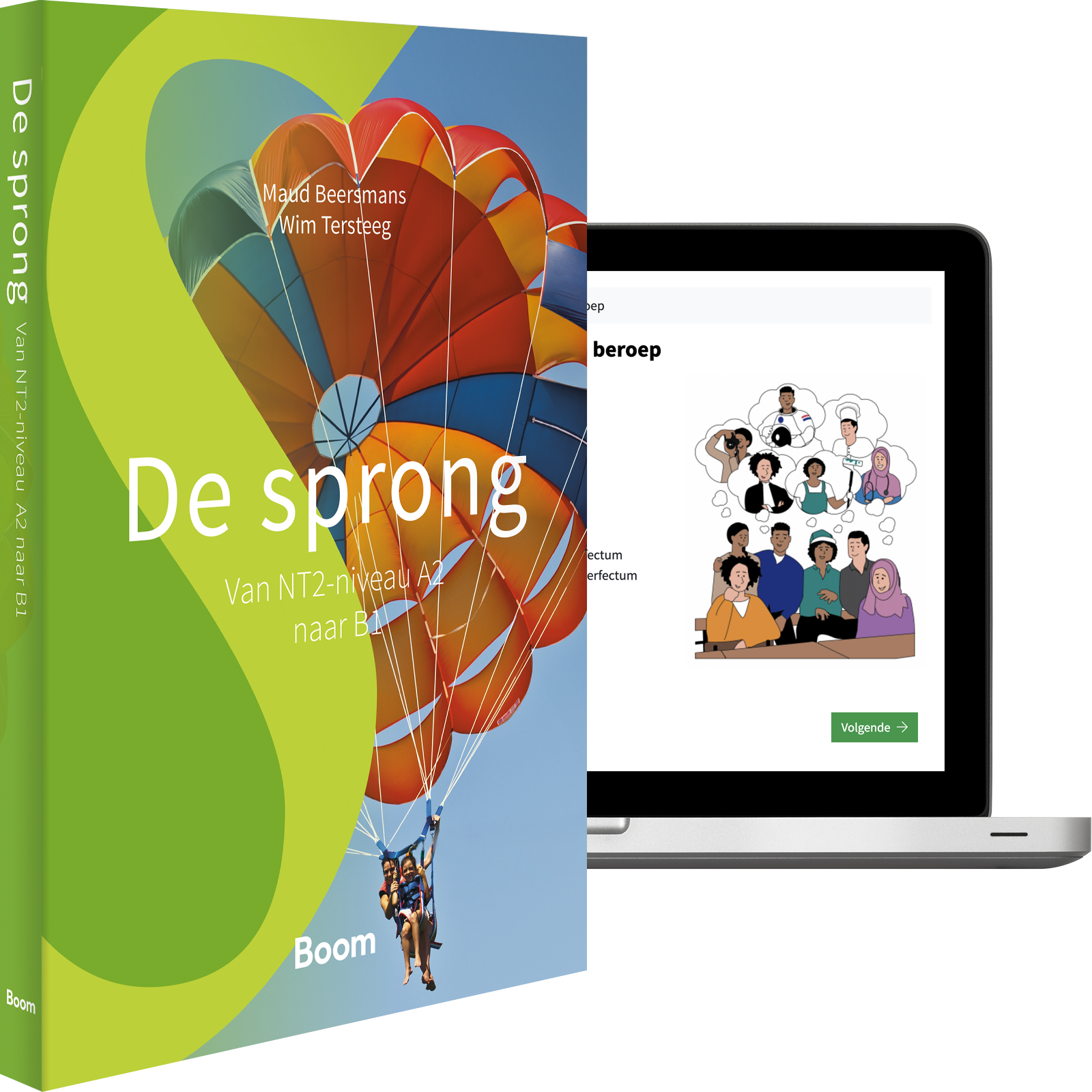De sprong is onderdeel van de leerlijn NT2 op maat. Het helpt je de grote stap van taalniveau A2 naar B1 te maken. Net als de andere delen uit de leerlijn 'NT2 op maat', De opmaat - herziene editie (0>A2) en De finale (B1>B2), behandelt De sprong onderwerpen die aansluiten bij het dagelijks leven, zoals studie, beroep, samenleving, communicatie, politiek en kunst. In elk thema worden de vaardigheden spreken, luisteren, schrijven en lezen afgewisseld en wordt er extra aandacht besteed aan woordenschat en grammatica. Door het gebruik van veel origineel materiaal uit kranten en van internet is de methode natuurlijk en aansprekend.