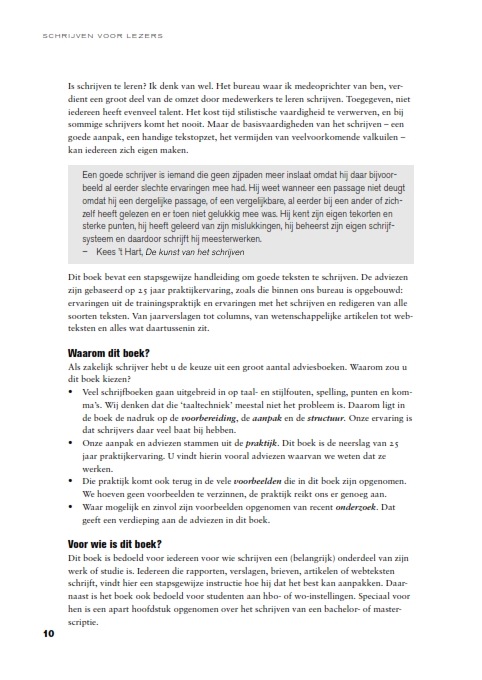 Wat maakt Schrijven voor lezers anders dan andere taaladviesboeken? Ten eerste de praktische inslag: het boek is de neerslag van 25 jaar praktijkervaring. Ten tweede gaat het in Schrijven voor lezers niet om punten en komma's of taalfouten: het boek concentreert zich op de valkuilen waarmee schrijvers dagelijks te maken hebben. Voorbeelden zijn de afbakening, de tekststructuur en de beste strategie. Schrijven voor lezers laat je zien hoe je hier op een praktische en effectieve manier mee aan de slag gaat.