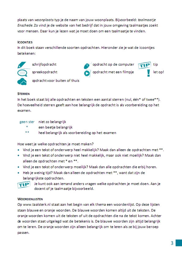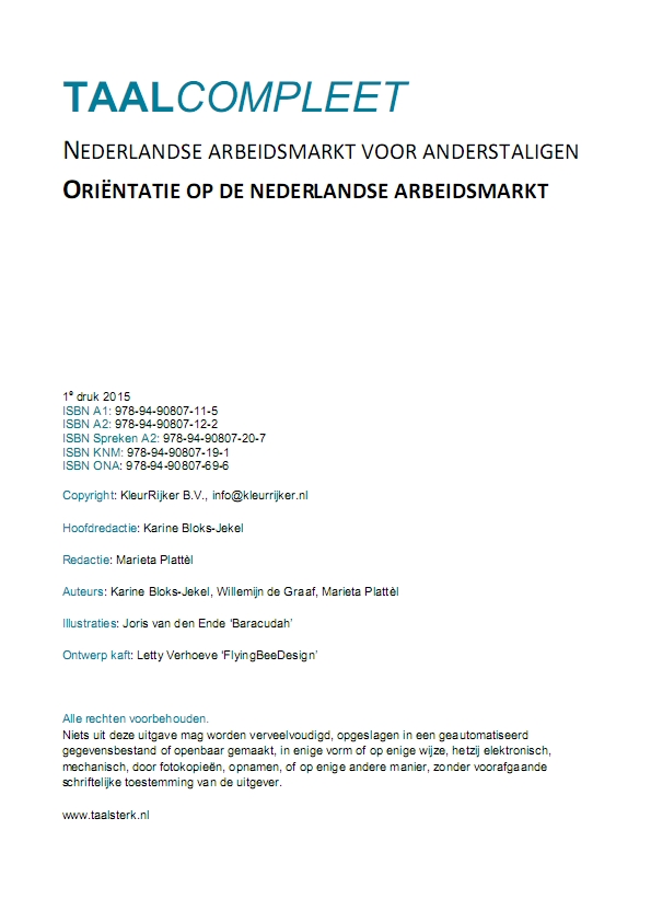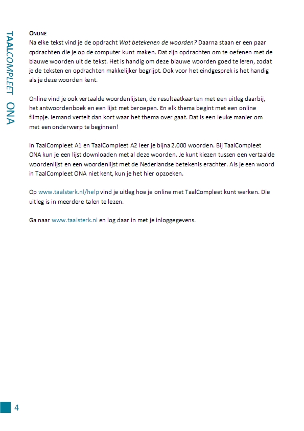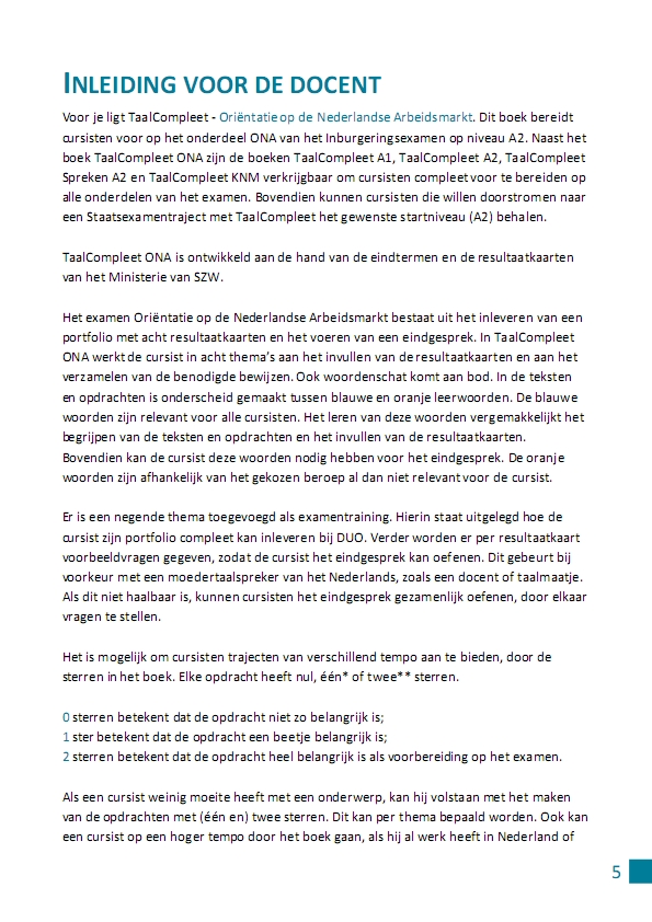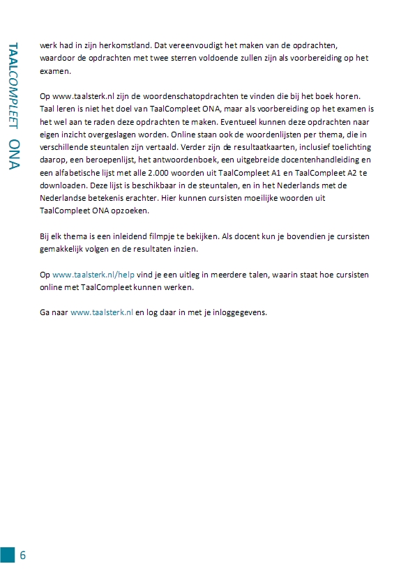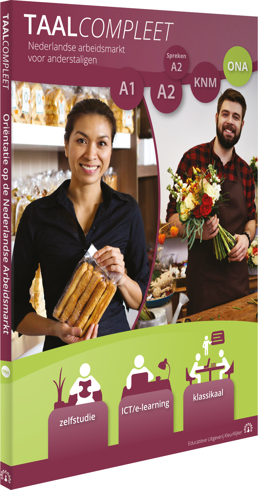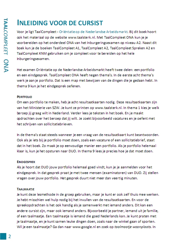 Met TaalCompleet ONA bereid je je voor op het onderdeel ONA (Oriëntatie op de Nederlandse Arbeidsmarkt) van het inburgeringsexamen. Je krijgt hulp bij het invullen van de 8 resultaatkaarten en het oefenen van het eindgesprek. Ook oefen je de belangrijke Nederlandse woorden. De lesmethode bestaat uit een boek en een online omgeving met een startfilm voor iedere module, een woordenschattrainer en extra materiaal.
