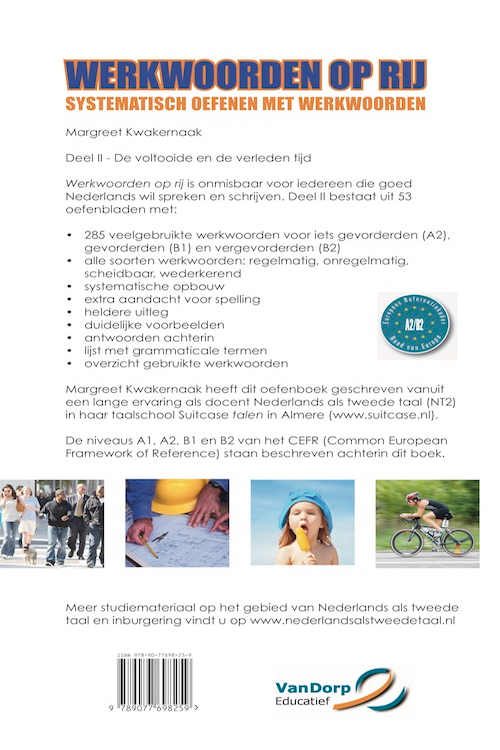 Werkwoorden op Rij deel II is een welkome hulp voor anderstaligen die correcter Nederlands willen spreken en vooral schrijven. Met het oefenboekje oefent u op systematische wijze de verbuiging van werkwoorden in de verleden en voltooide tijd. Dit oefenboekje kan gebruikt worden vanaf niveau A1 maar is tevens geschikt voor gevorderde NT2-ers die nog moeite hebben met de basisprincipes van de werkwoordsverbuigingen.