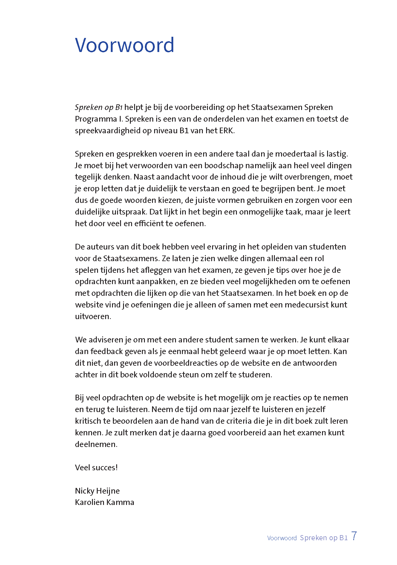 Spreken op B1 herziene editie is bedoeld voor anderstaligen die zich voorbereiden op het onderdeel spreken van het Staatsexamen I, en voor cursisten die hun spreekvaardigheid op dit niveau willen trainen.
