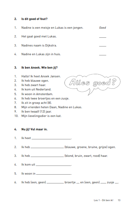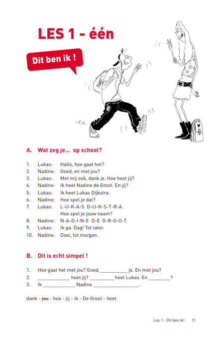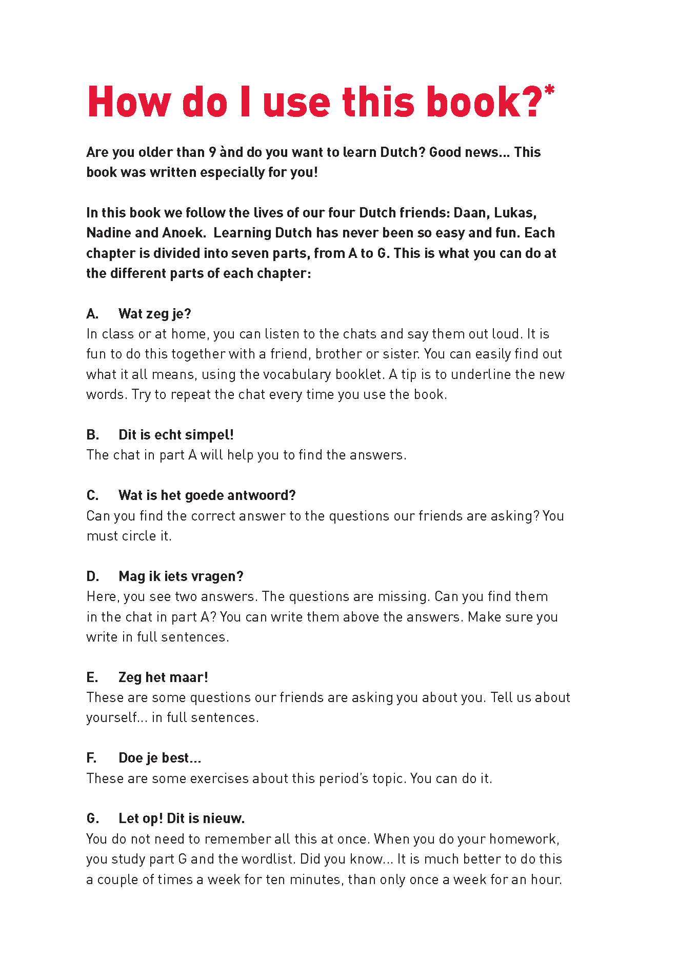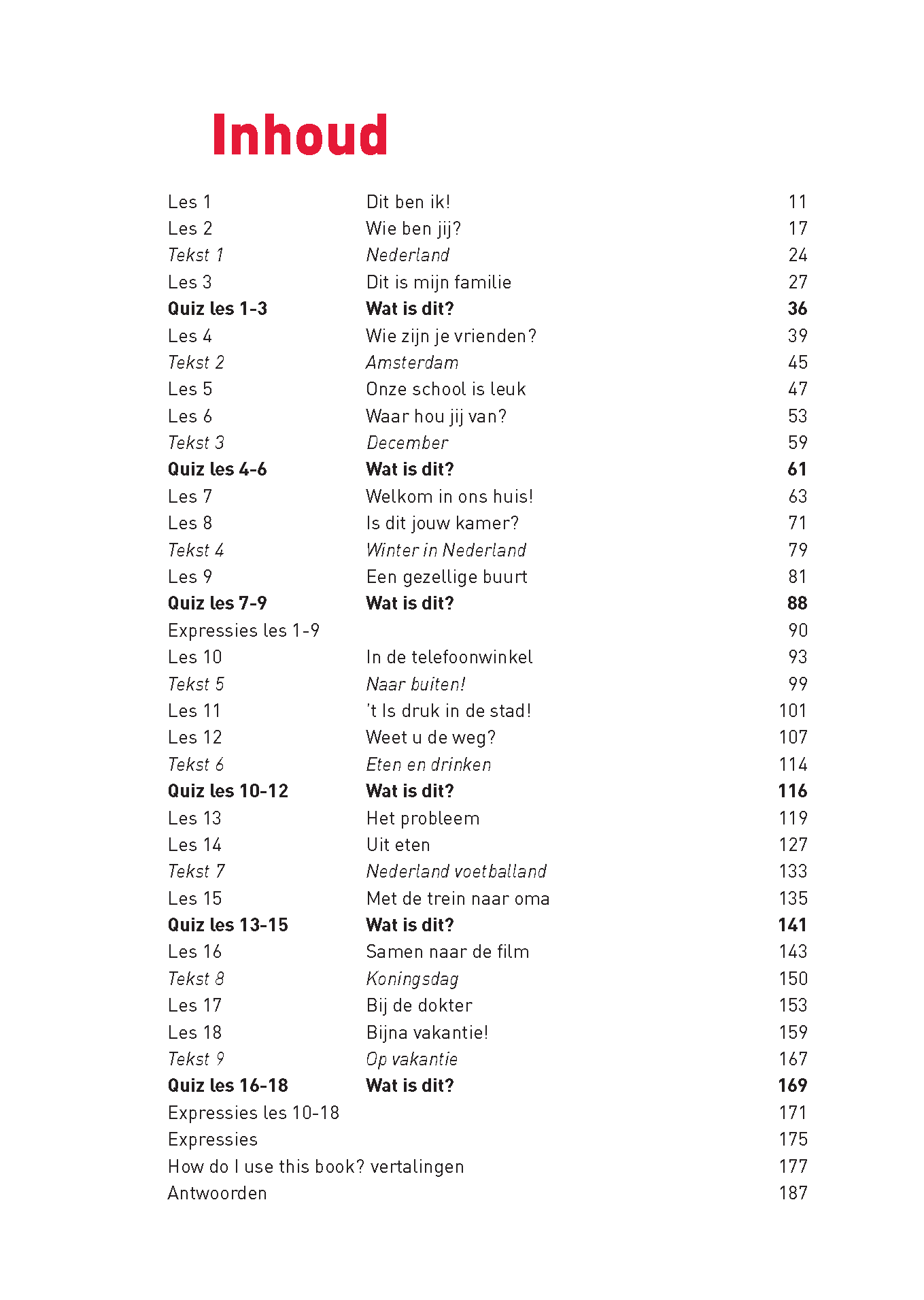 De methode omvat een tekst- en werkboek ineen met 18 lessen. Elk hoofdstuk heeft een in de belevingswereld van kinderen en tieners herkenbaar en relevant thema. De lessen hebben een duidelijke structuur met een dialoog, korte, prikkelende tekstjes, oefeningen en functionele spelletjes. De methode heeft een overzichtelijke opmaak met veel illustraties en bevat woordenlijsten in het Engels, Frans, Spaans, Turks en Arabisch.
