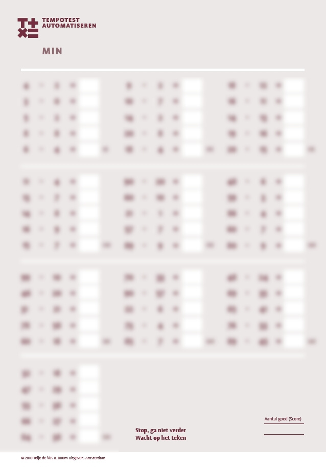 Met de TempoTest Automatiseren (TTA) stel je de automatiseringsgraad van optellen, aftrekken, vermenigvuldigen en delen vast en kun je deze analyseren. De test is bedoeld voor leerlingen in het basisonderwijs van groep 3 tot en met 8 (voor Vlaanderen leerjaar 1 tot en met 6).