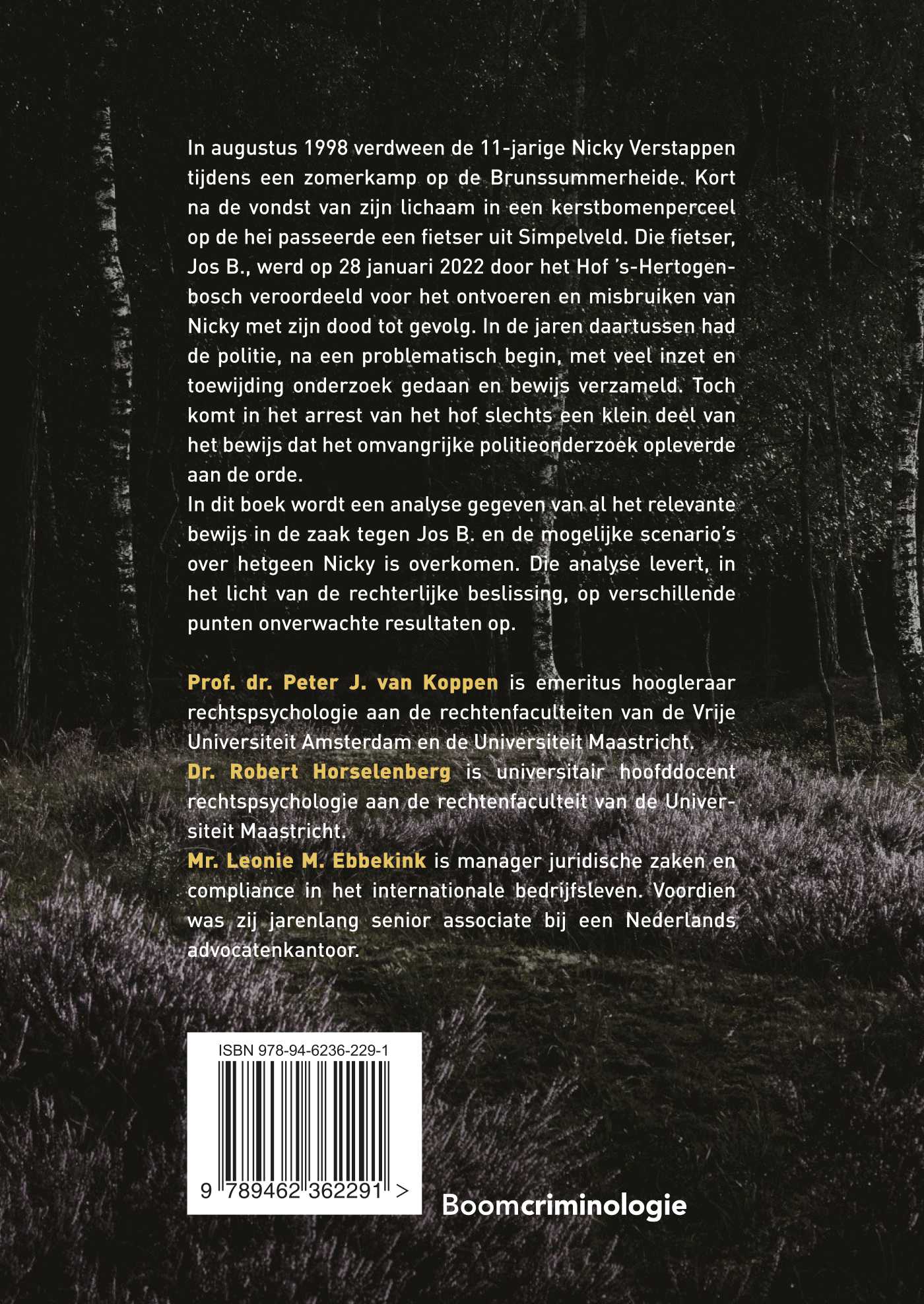 In augustus 1998 verdween de 11-jarige Nicky Verstappen tijdens een zomerkamp op de Brunssummerheide. Kort na de vondst van zijn lichaam in een kerstbomenperceel op de hei passeerde een fietser uit Simpelveld. Die fietser, Jos B., werd op 28 januari 2022 door het Hof ’s-Hertogenbosch veroordeeld voor het ontvoeren en misbruiken van Nicky met zijn dood tot gevolg. In de jaren daartussen had de politie, na een problematisch begin, met veel inzet en toewijding onderzoek gedaan en bewijs verzameld. Toch komt in het arrest van het hof slechts een klein deel van het bewijs dat het omvangrijke politieonderzoek opleverde aan de orde. In dit boek wordt een analyse gegeven van al het relevante bewijs in de zaak tegen Jos B. en de mogelijke scenario’s over hetgeen Nicky is overkomen. Die analyse levert, in het licht van de rechterlijke beslissing, op verschillende punten onverwachte resultaten op.