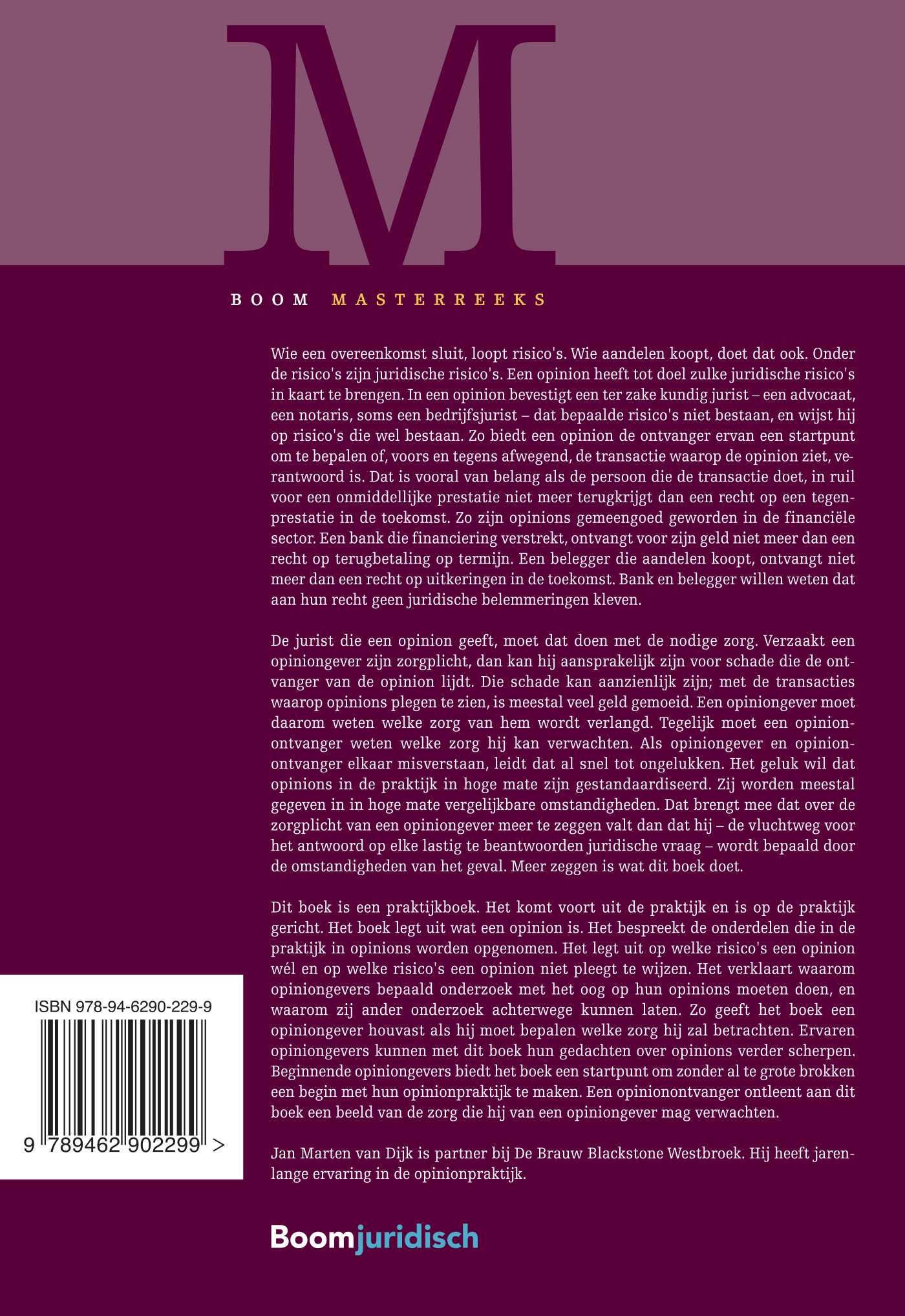 De jurist die een opinion geeft, moet dat doen met de nodige zorg. Verzaakt een opiniongever zijn zorgplicht, dan kan hij aansprakelijk zijn voor schade die de ontvanger van de opinion lijdt. Een opiniongever moet daarom weten welke zorg van hem wordt verlangd. Tegelijk moet een opinionontvanger weten welke zorg hij kan verwachten. Het geluk wil dat opinions in de praktijk in hoge mate zijn gestandaardiseerd. Zij worden meestal gegeven in in hoge mate vergelijkbare omstandigheden. Dat brengt mee dat over de zorgplicht van een opiniongever meer te zeggen valt dan dat hij - de vluchtweg voor het antwoord op elke lastig te beantwoorden juridische vraag - wordt bepaald door de omstandigheden van het geval. Meer zeggen is wat dit boek doet.