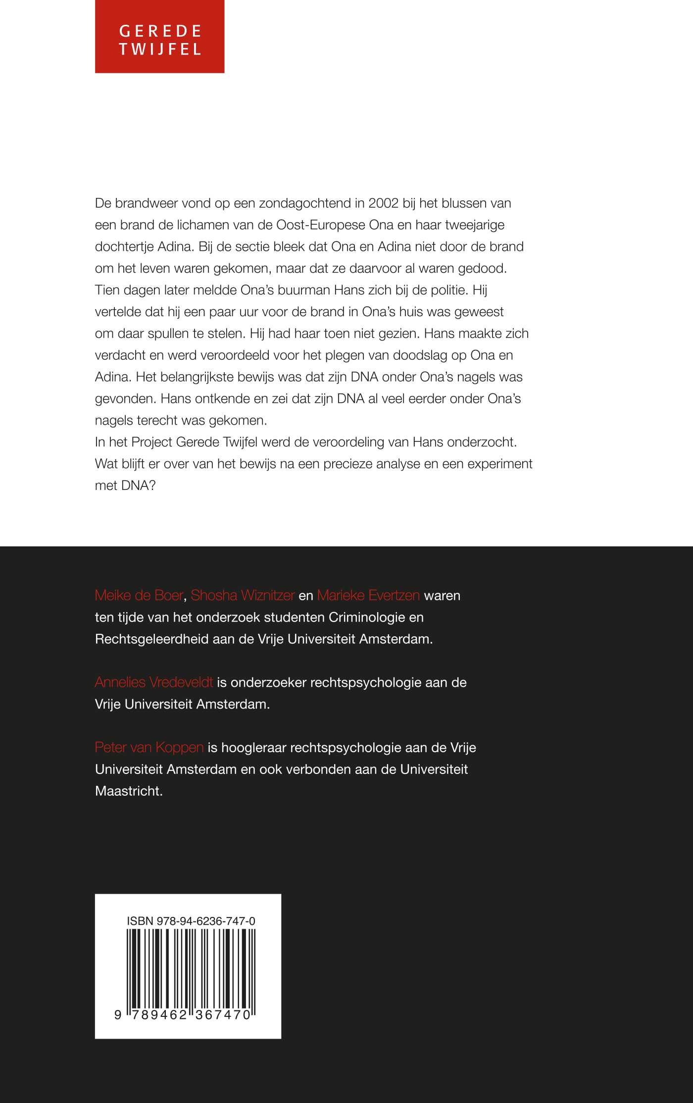 De brandweer vond op een zondagochtend in 2002 bij het blussen van een brand de lichamen van de Oost-Europese Ona en haar tweejarige dochtertje Adina. Bij de sectie bleek dat Ona en Adina niet door de brand om het leven waren gekomen, maar dat ze daarvoor al waren gedood. Tien dagen later meldde Ona’s buurman Hans zich bij de politie. Hij vertelde dat hij een paar uur voor de brand in Ona’s huis was geweest om daar spullen te stelen. Hij had haar toen niet gezien. Hans maakte zich verdacht en werd veroordeeld voor het plegen van doodslag op Ona en Adina. Het belangrijkste bewijs was dat zijn DNA onder Ona’s nagels was gevonden. Hans ontkende en zei dat zijn DNA al veel eerder onder Ona’s nagels terecht was gekomen. In het Project Gerede Twijfel werd de veroordeling van Hans onderzocht. Wat blijft er over van het bewijs na een precieze analyse en een experiment met DNA?