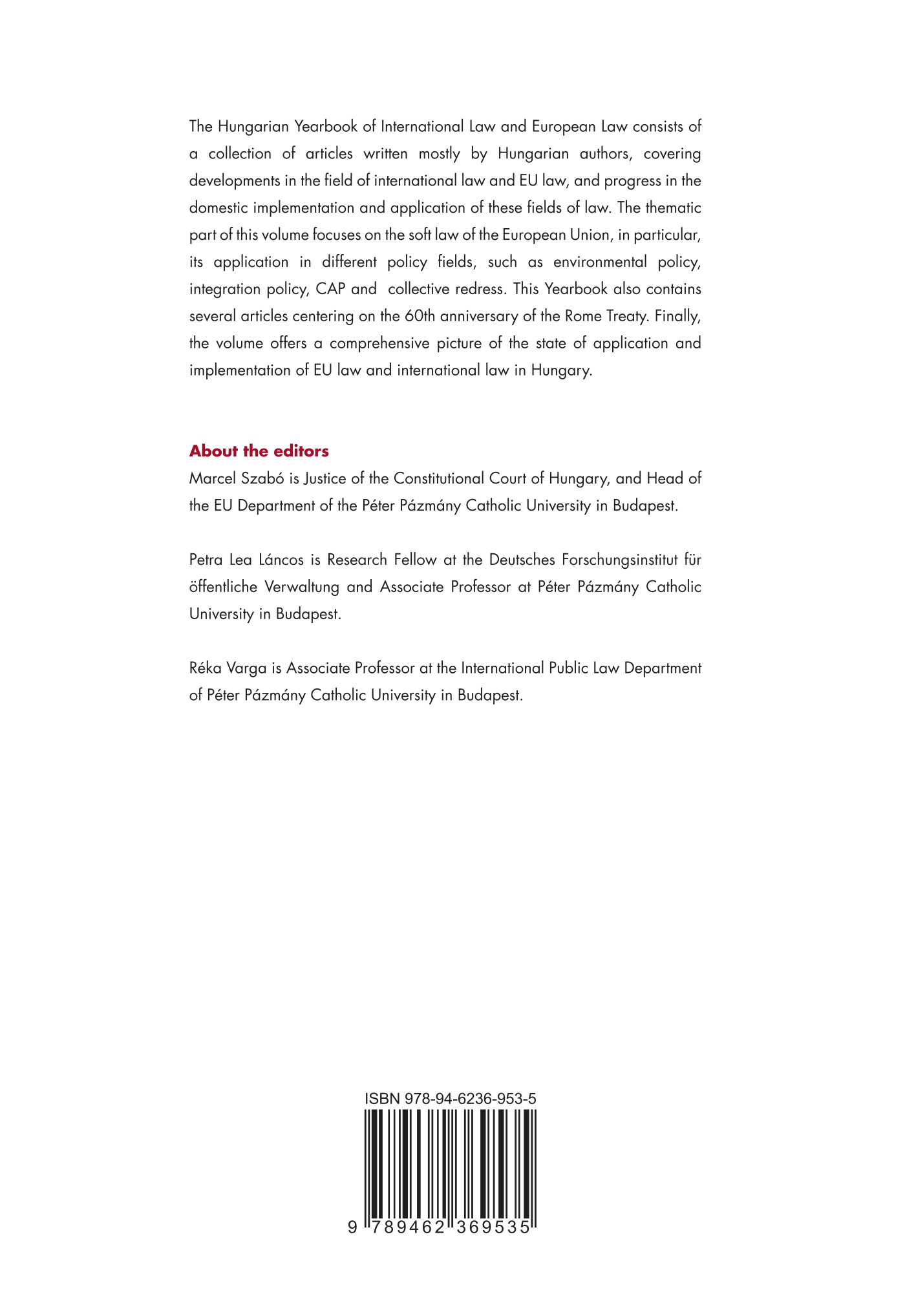 The Hungarian Yearbook of International Law and European Law consists of a collection of articles written mostly by Hungarian authors, covering developments in the field of international law and EU law, and progress in the domestic implementation and application of these fields of law. The thematic part of this volume focuses on the soft law of the European Union, in particular, its application in different policy fields, such as environmental policy, integration policy, CAP and collective redress. This Yearbook also contains several articles centering on the 60th anniversary of the Rome Treaty. Finally, the volume offers a comprehensive picture of the state of application and implementation of EU law and international law in Hungary.