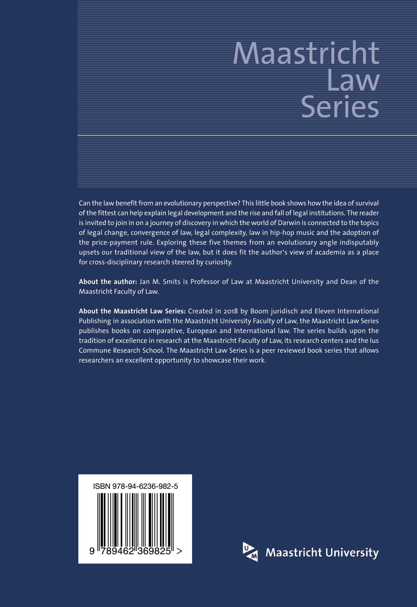Can the law benefit from an evolutionary perspective? This little book shows how the idea of survival of the fittest can help explain legal development and the rise and fall of legal institutions. The reader is invited to join in on a journey of discovery in which the world of Darwin is connected to the topics of legal change, convergence of law, legal complexity, law in hip-hop music and the adoption of the price-payment rule. Exploring these five themes from an evolutionary angle indisputably upsets our traditional view of the law, but it does fit the author’s view of academia as a place for cross-disciplinary research steered by curiosity.