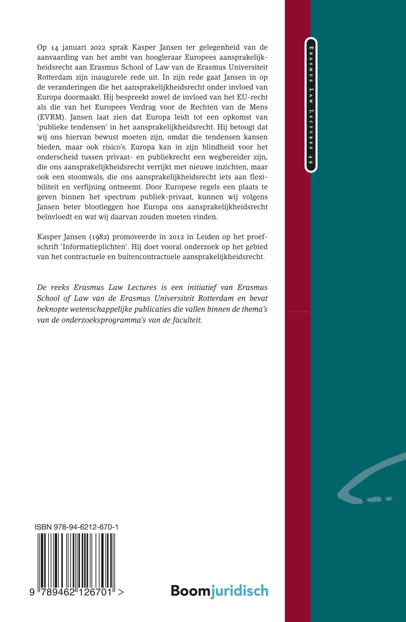 Op 14 januari 2022 sprak Kasper Jansen ter gelegenheid van de aanvaarding van het ambt van hoogleraar Europees aansprakelijkheidsrecht aan Erasmus School of Law van de Erasmus Universiteit Rotterdam zijn inaugurele rede uit. In zijn rede gaat Jansen in op de veranderingen die het aansprakelijkheidsrecht onder invloed van Europa doormaakt. Hij bespreekt zowel de invloed van het EU-recht als die van het Europees Verdrag voor de Rechten van de Mens (EVRM). Jansen laat zien dat Europa leidt tot een opkomst van ‘publieke tendensen’ in het aansprakelijkheidsrecht. Hij betoogt dat wij ons hiervan bewust moeten zijn, omdat die tendensen kansen bieden, maar ook risico’s. Europa kan in zijn blindheid voor het onderscheid tussen privaat- en publiekrecht een wegbereider zijn, die ons aansprakelijkheidsrecht verrijkt met nieuwe inzichten, maar ook een stoomwals, die ons aansprakelijkheidsrecht iets aan flexibiliteit en verfijning ontneemt. Door Europese regels een plaats te geven binnen het spectrum publiek-privaat, kunnen wij volgens Jansen beter blootleggen hoe Europa ons aansprakelijkheidsrecht beïnvloedt en wat wij daarvan zouden moeten vinden.