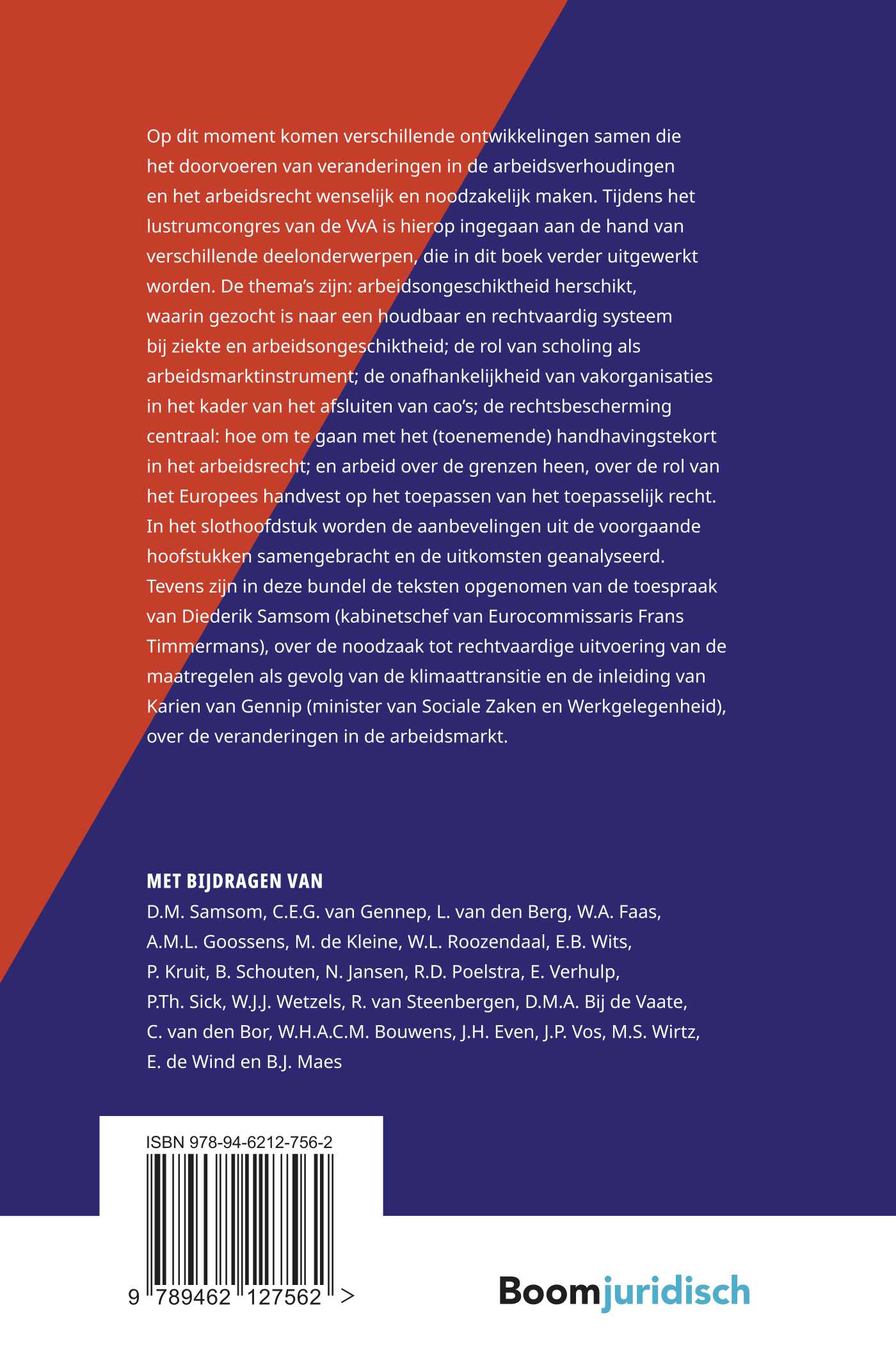 Op dit moment komen verschillende ontwikkelingen samen die het doorvoeren van veranderingen in de arbeidsverhoudingen en het arbeidsrecht wenselijk en noodzakelijk maken. Tijdens het lustrumcongres van de VvA is hierop ingegaan aan de hand van verschillende deelonderwerpen, die in dit boek verder uitgewerkt worden. De thema’s zijn: arbeidsongeschiktheid herschikt, waarin gezocht is naar een houdbaar en rechtvaardig systeem bij ziekte en arbeidsongeschiktheid; de rol van scholing als arbeidsmarktinstrument; de onafhankelijkheid van vakorganisaties in het kader van het afsluiten van cao’s; de rechtsbescherming centraal: hoe om te gaan met het (toenemende) handhavingstekort in het arbeidsrecht; en arbeid over de grenzen heen, over de rol van het Europees handvest op het toepassen van het toepasselijk recht. In het slothoofdstuk worden de aanbevelingen uit de voorgaande hoofstukken samengebracht en de uitkomsten geanalyseerd. Tevens zijn in deze bundel de teksten opgenomen van de toespraak van Diederik Samsom (kabinetschef van Eurocommissaris Frans Timmermans), over de noodzaak tot rechtvaardige uitvoering van de maatregelen als gevolg van de klimaattransitie en de inleiding van Karien van Gennip (minister van Sociale Zaken en Werkgelegenheid), over de veranderingen in de arbeidsmarkt.
