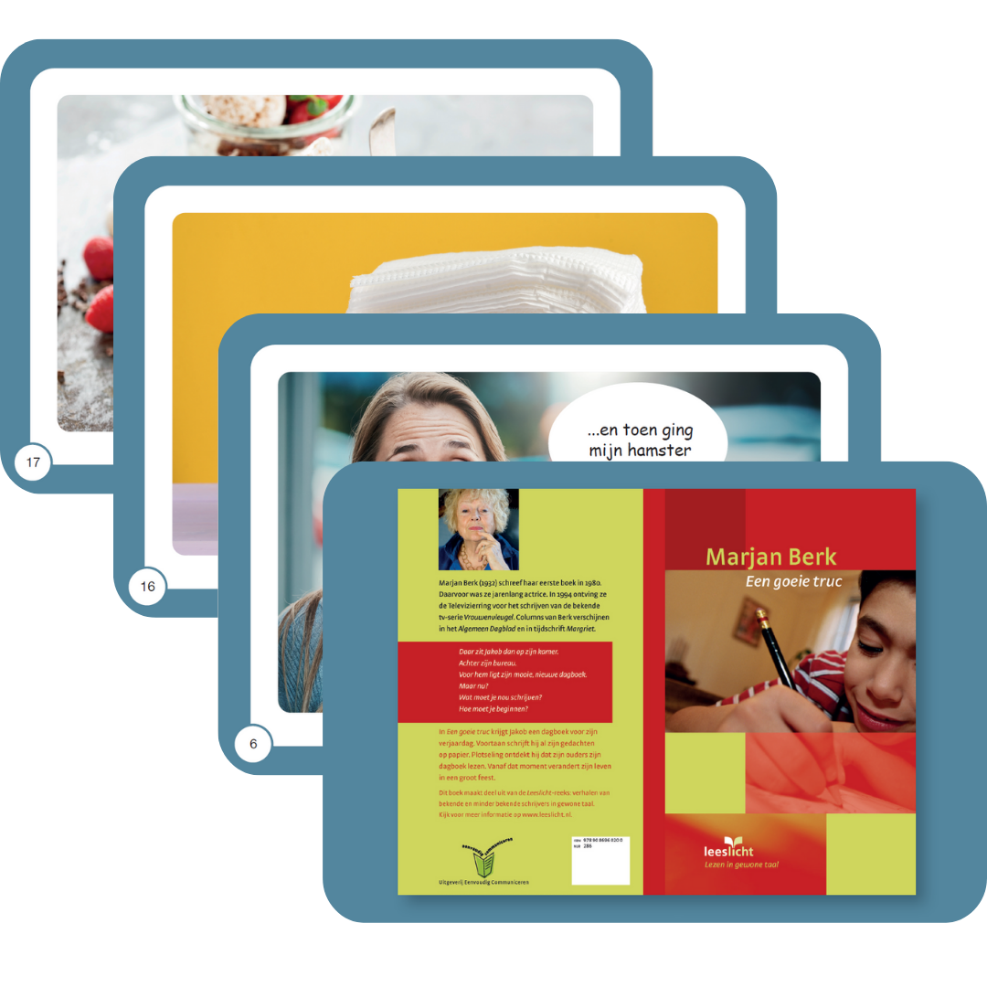 Uitgeverij Eenvoudig Communiceren en uitgeverij De Stiep zijn specialisten in het uitgeven van boeken in eenvoudige taal. Daarom koos Stichting Lezen en Schrijven een aantal van hun boeken om de meeleeskringkaarten bij te ontwikkelen. In totaal maakten we praatplaten bij 17 titels. Sommige boeken hebben meer moeilijke woorden dan andere, daardoor is het aantal kaarten per boek verschillend. In de webshop vind je bij welke titels er kaarten zijn ontwikkeld.