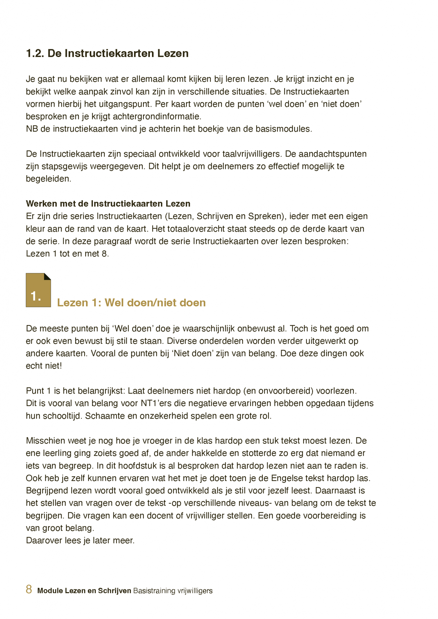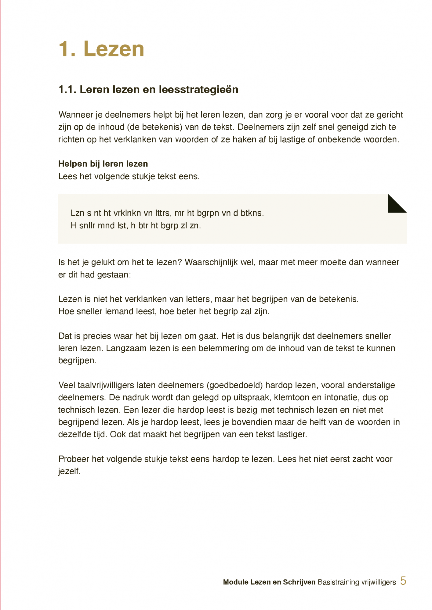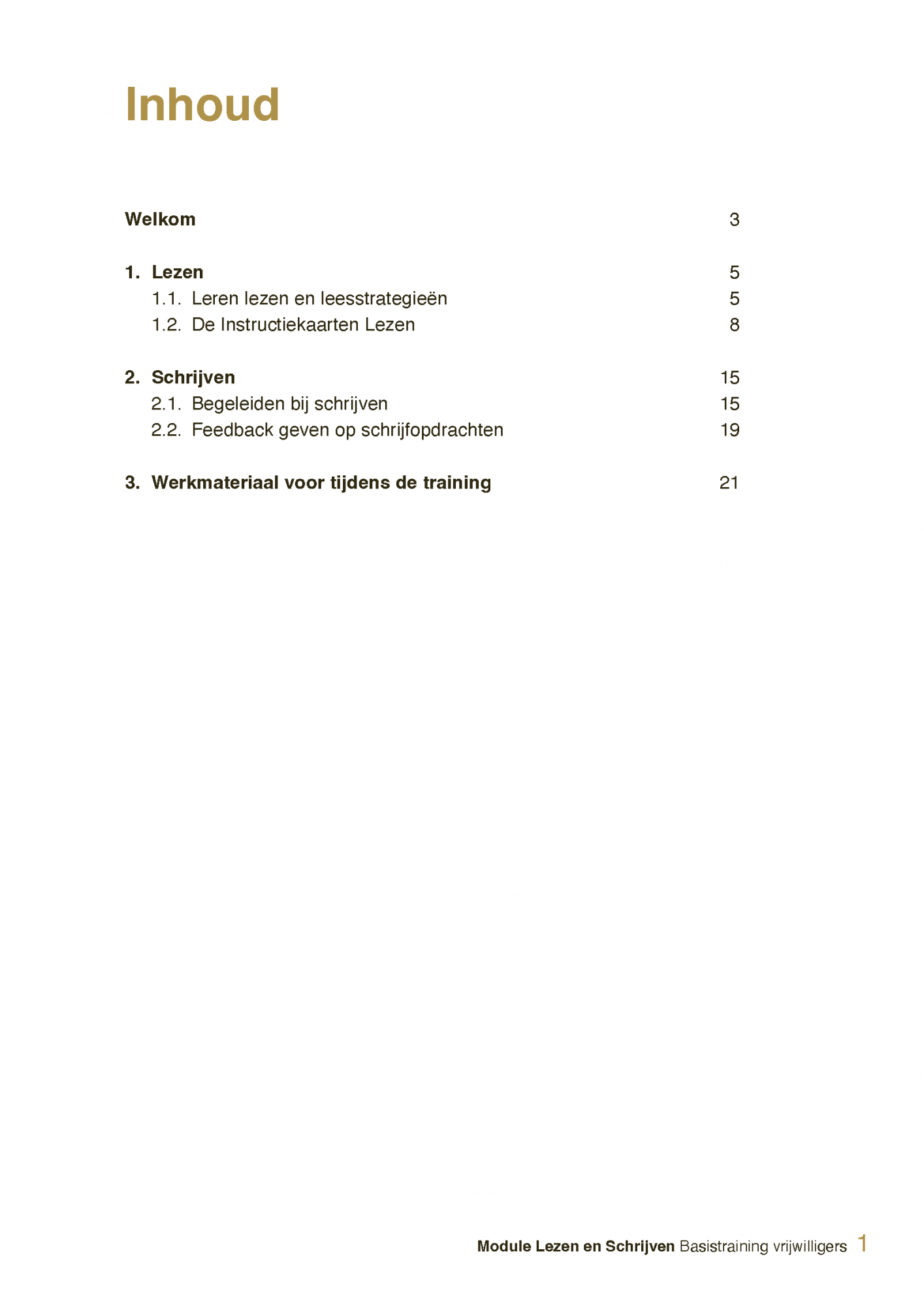In de Module Lezen en schrijven krijgen taalvrijwilligers informatie over wat je wel (en beter niet) kunt doen bij het begeleiden van een deelnemer. Dit boekje hoort bij de verdiepende trainingen lezen en schrijven. In de module komen de volgende onderwerpen aan bod: